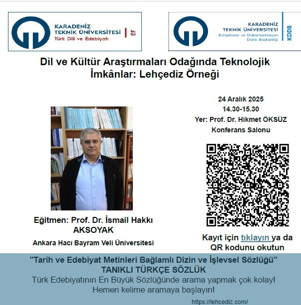 Kütüphane ve Dokümantasyon Daire Başkanlığı ile bölümümüzün ortak olarak düzenlediği ''Dil ve Kültür Araştırmaları Odağında Teknolojik İmkanlar: Lehçediz Örneği'' başlıklı etkinlik, 24.12.2025 saat 14.30'da gerçekleştirilecektir.