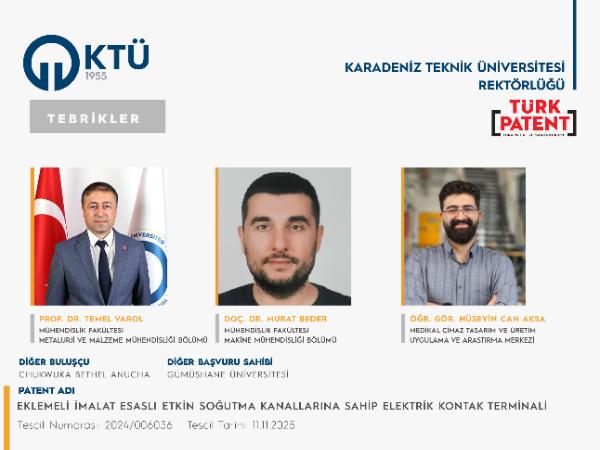 Ulusal Patent başvurusu tescillenen akademisyenlerimizi ve buluşçuları tebrik eder, akademisyenlerimizin KTÜ Ekolüne verdiği katkılardan dolayı teşekkür ederiz.