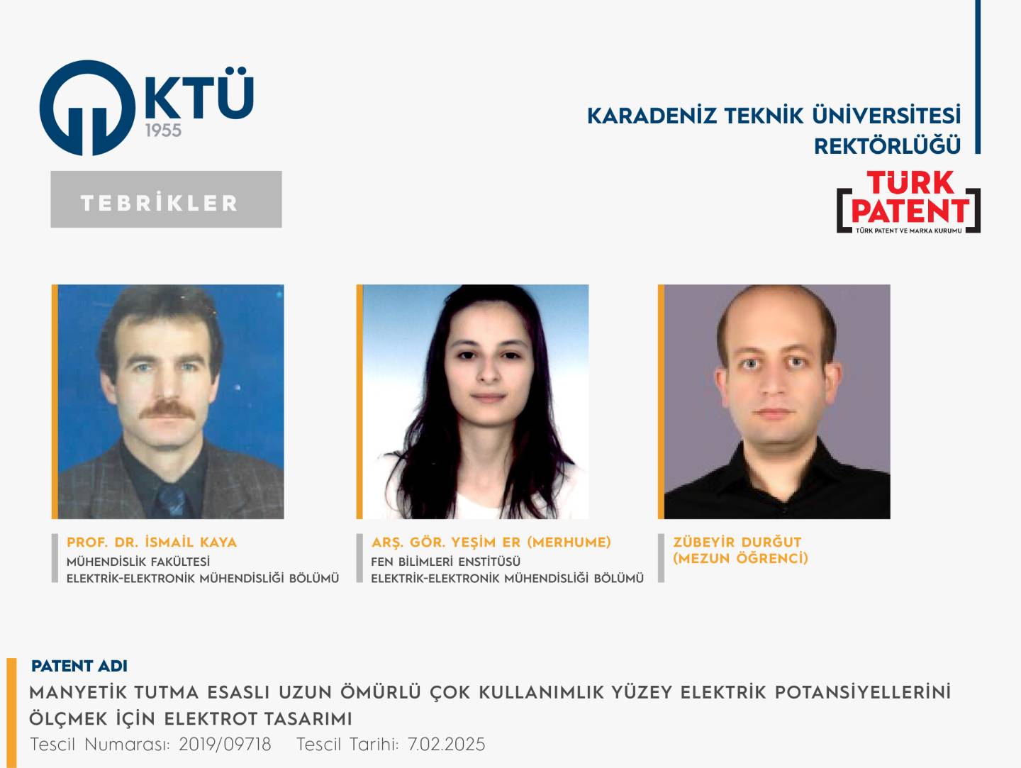 Patent başvurusu tescillenen akademisyenlerimizi tebrik eder, sağladıkları katkılardan ötürü akademisyenlerimize teşekkür ederiz.