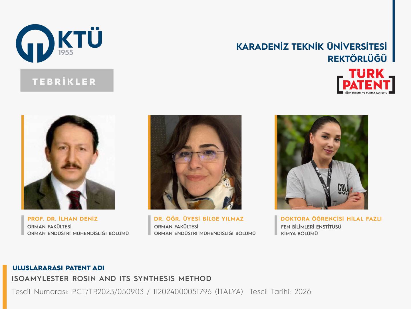 Uluslararası patent başvurusu tescillenen akademisyenlerimizi ve öğrencimizi tebrik eder, sağladıkları katkılardan ötürü akademisyenlerimize ve öğrencimize teşekkür ederiz.