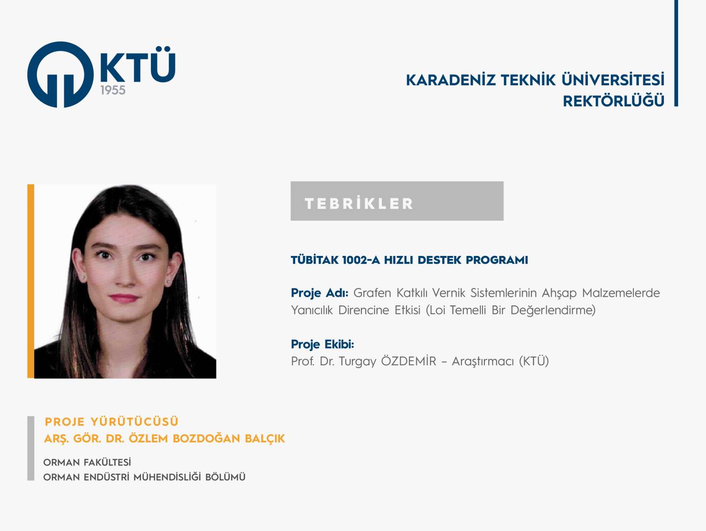 Üniversitemiz Orman Fakültesi Orman Endüstri Mühendisliği Bölümü’nden Öğretim Elemanı Arş. Gör. Dr. Özlem BOZDOĞAN BALÇIK’ın "Grafen Katkılı Vernik Sistemlerinin Ahsap Malzemelerde Yanıcılık Direncine Etkisi (Loi Temelli Bir Degerlendirme)” başlıklı projesi, “TÜBİTAK 1002-A Hızlı Destek Programı” kapsamında desteklendi.