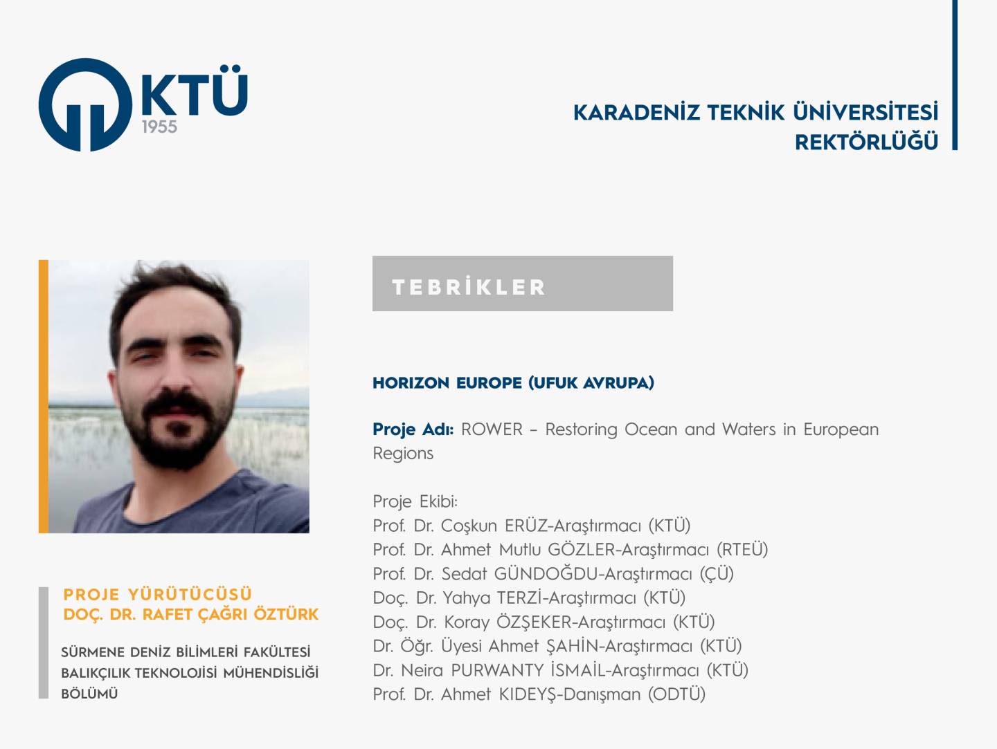 Üniversitemiz Sürmene Deniz Bilimleri Fakültesi Balıkçılık Teknolojisi Mühendisliği Bölümü’nden Öğretim Üyesi Doç. Dr. Rafet Çağrı ÖZTÜRK’ün ortak olarak yer aldığı, University of Tartu, Estonian Marine Institute koordinatörlüğünde hazırlanan “ROWER – Restoring Ocean and Waters in European Regions” başlıklı projesi, Horizon Europe Restore Our Ocean and Waters Mission hedefini destekleyen HORIZON-MISS-2025-03-OCEAN-04 çağrısı kapsamında desteklendi.