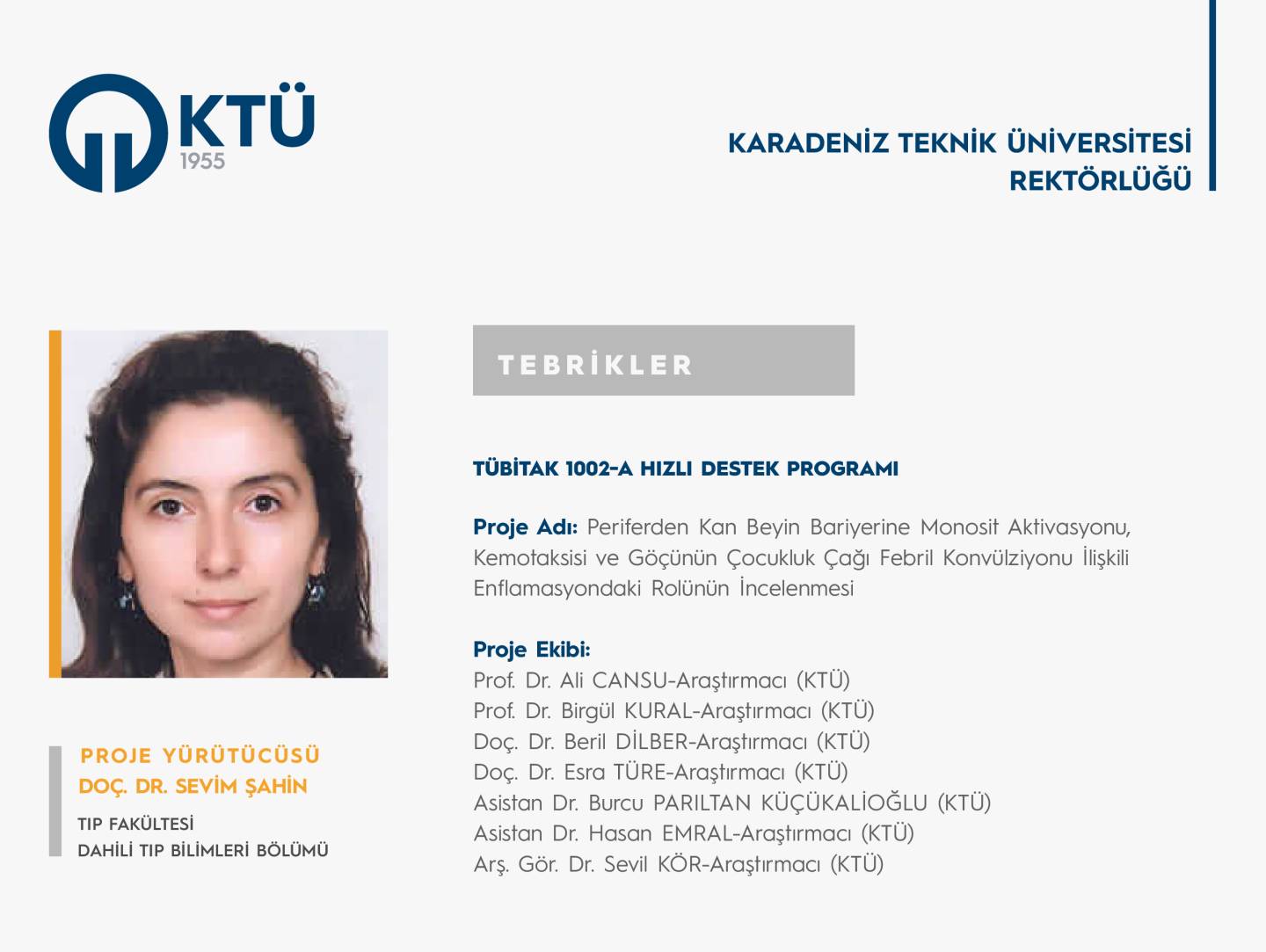 Üniversitemiz Tıp Fakültesi Dahili Tıp Bilimleri Bölümü’nden Doç. Dr. Sevim ŞAHİN’in “Periferden Kan Beyin Bariyerine Monosit Aktivasyonu, Kemotaksisi ve Göçünün Çocukluk Çağı Febril Konvulziyonu İlişkili Enflamasyondaki Rolünün İncelenmesi” başlıklı projesi, “TÜBİTAK 1002-A Hızlı Destek Programı” kapsamında desteklendi. Projesi desteklenen araştırmacımızı ve proje ekibini tebrik eder, başarılarının devamını dileriz.