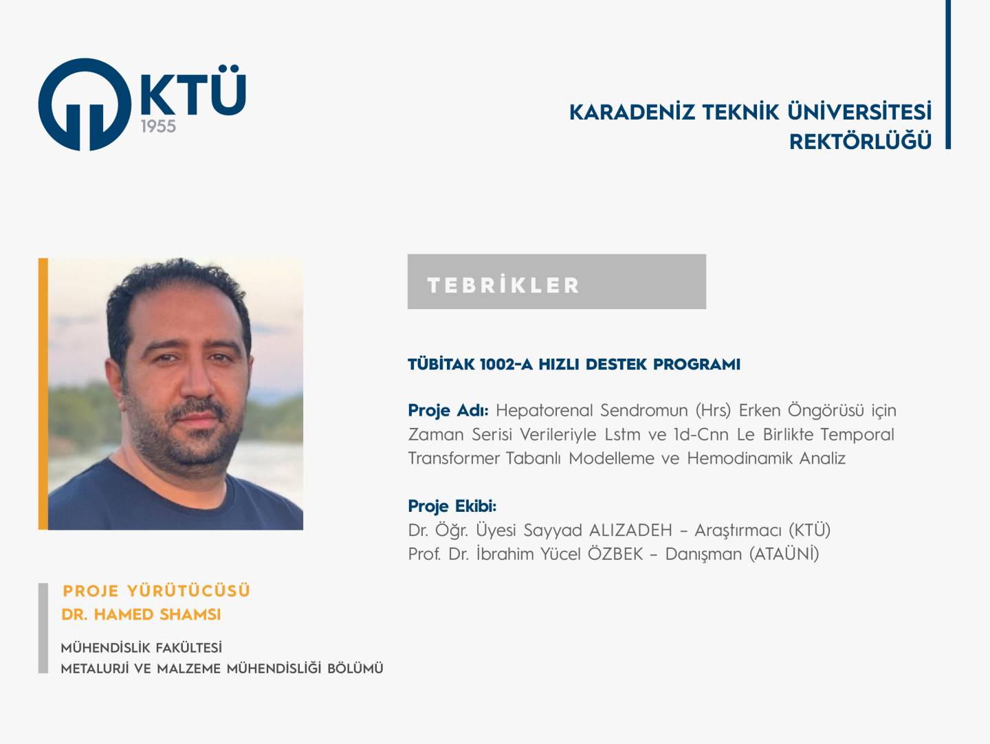 Dr. Sonrası Araştırmacı Hamed SHAMSI’nin "Hepatorenal Sendromun (Hrs) Erken Öngörüsü için Zaman Serisi Verileriyle Lstm ve 1d-Cnn Le Birlikte Temporal Transformer Tabanlı Modelleme ve Hemodinamik Analiz” başlıklı projesi, “TÜBİTAK 1002-A Hızlı Destek Programı” kapsamında desteklendi.