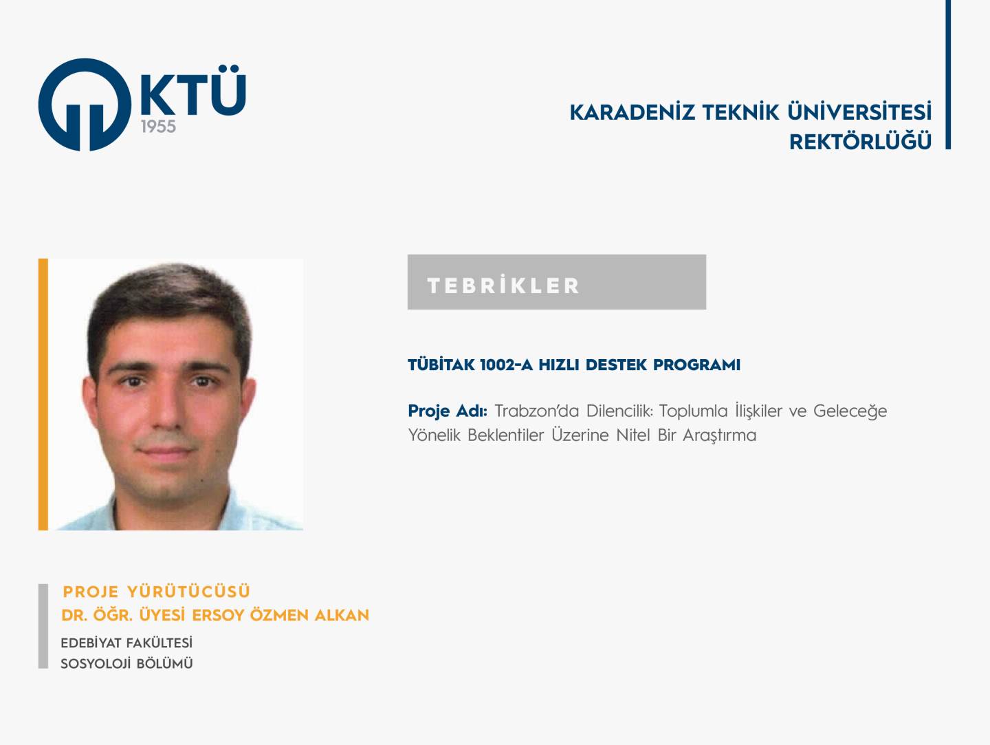 Üniversitemiz Edebiyat Fakültesi Sosyoloji Bölümü Öğretim Üyelerinden Dr. Öğr. Üyesi Ersoy Özmen ALKAN’ın "Trabzon’da Dilencilik: Toplumla İlişkiler ve Geleceğe Yönelik Beklentiler Üzerine Nitel Bir Araştırma” başlıklı projesi, “TÜBİTAK 1002-A Hızlı Destek Programı” kapsamında desteklendi.