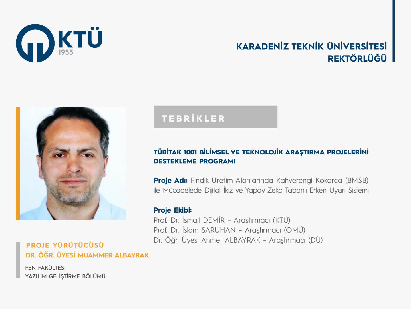 Üniversitemiz Fen Fakültesi Yazılım Geliştirme Bölümü öğretim üyelerinden Dr. Öğr. Üyesi Muammer ALBAYRAK’ın “Fındık Üretim Alanlarında Kahverengi Kokarca (BMSB) ile Mücadelede Dijital İkiz ve Yapay Zeka Tabanlı Erken Uyarı Sistemi” başlıklı projesi, “TÜBİTAK 1001 Bilimsel ve Teknolojik Araştırma Projelerini Destekleme Programı” kapsamında desteklendi.