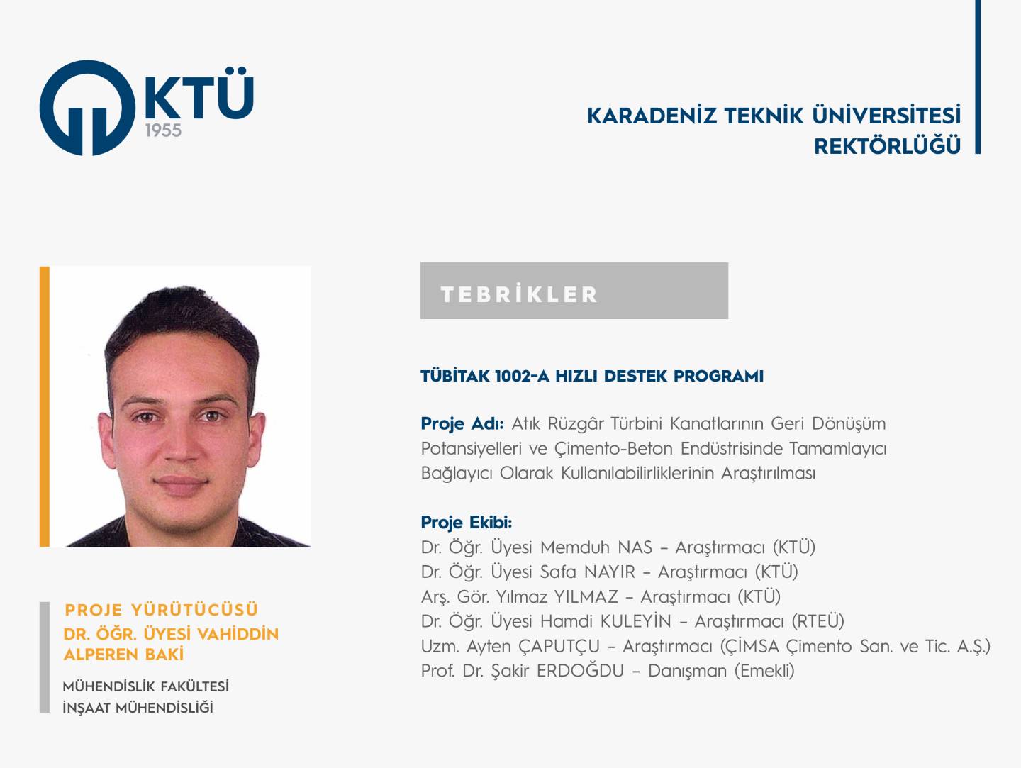 Üniversitemiz Mühendislik Fakültesi İnşaat Mühendisliği Bölümü Öğretim Üyelerinden Dr. Öğr. Üyesi Vahiddin Alperen BAKİ’nin "Atık Rüzgâr Türbini Kanatlarının Geri Dönüşüm Potansiyelleri ve Çimento-Beton Endüstrisinde Tamamlayıcı Bağlayıcı Olarak Kullanılabilirliklerinin Araştırılması” başlıklı projesi, “TÜBİTAK 1002-A Hızlı Destek Programı” kapsamında desteklenmiştir.