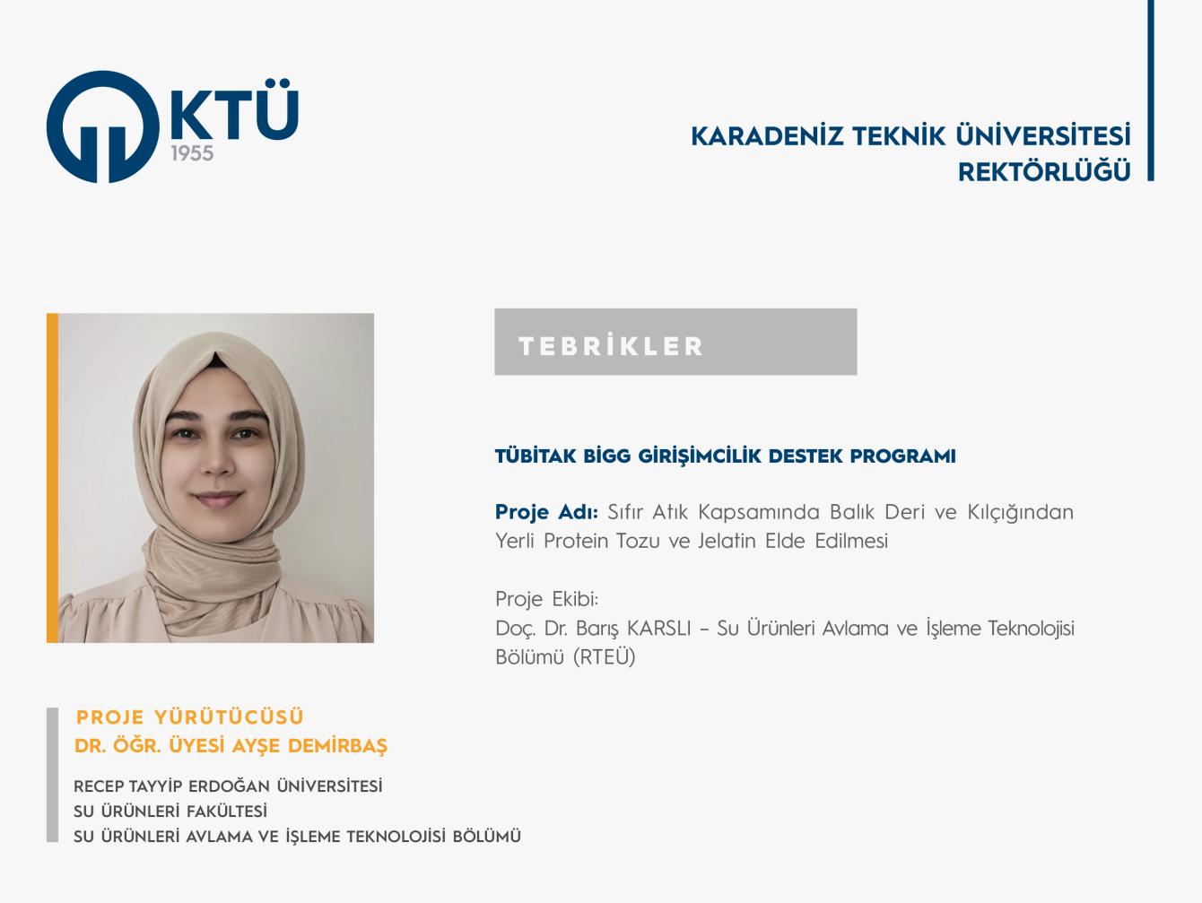 Recep Tayyip Erdoğan Üniversitesi Su Ürünleri Fakültesi, Su Ürünleri Avlama ve İşleme Teknolojisi Bölümü öğretim üyelerinden Dr. Öğr. Üyesi Ayşe DEMİRBAŞ’ın, “Sıfır Atık Kapsamında Balık Deri ve Kılçığından Yerli Protein Tozu ve Jelatin Elde Edilmesi” başlıklı projesi, TÜBİTAK BiGG Girişimcilik Destek Programı kapsamında desteklendi.