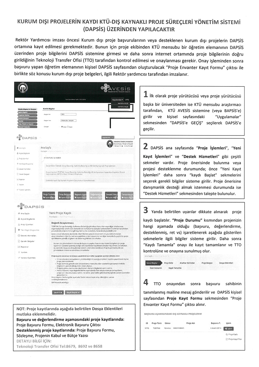 Rektör Yardımcısı imzası öncesi kurum dışı proje başvurularının veya desteklenen kurum dışı projelerin DAPSİS ortamına (dapsis.ktu.edu.tr) kayıt edilmesi gerekmektedir. Bunun için proje ekibinden KTÜ mensubu bir öğretim elemanının DAPSİS üzerinden proje bilgilerini DAPSİS sistemine girmesi ve daha sonra internet ortamında proje bilgilerinin doğru girildiğinin Teknoloji Transfer Ofisi (TTO) tarafından kontrol edilmesi ve onaylanması gerekir. Onay işleminden sonra başvuru yapan öğretim elemanının kişisel DAPSİS sayfasından oluşturulacak "Proje Kayıt Formu" çıktısı ile birlikte söz konusu kurum dışı proje belgeleri, ilgili Rektör Yardımcısı tarafından imzalanır. 27 Mart 2017 tarihinden itibaren DAPSİS sistemine (dapsis.ktu.edu.tr) kayıt edilmeyen ve proje kayıt formu alınmayan proje belgeleri Rektör Yardımcısı tarafından imzalanmayacaktır.