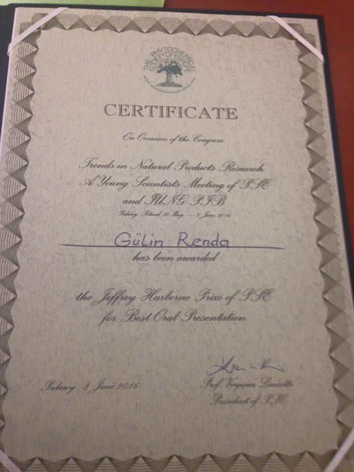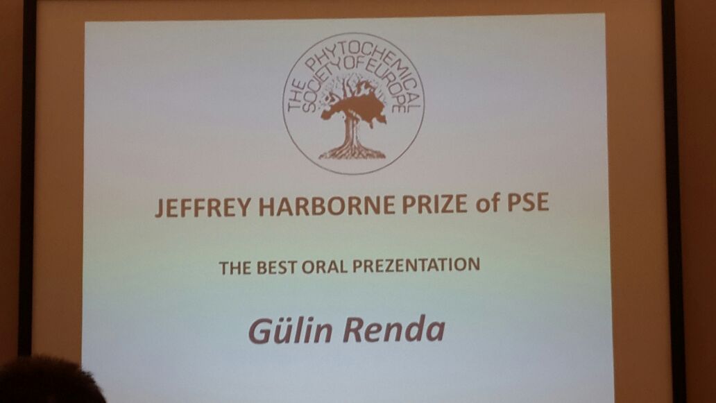 Eczacılık Fakültesi Farmakognozi Anabilim Dalı öğretim üyesi Yrd. Doç. Dr. Gülin Renda, 30 Mayıs - 2 Haziran 2016 tarihlerinde Polonya Pulawy'de düzenlenen Trends in Natural Products Research – PSE Young Scientists Meeting'de "Bioactivity-guided isolation of analgesic and anti-inflammatory compounds from Scrophularia kotschyana" başlıklı sunumu ile PSE Jeffrey Harborne Ödülü’ne layık görülmüştür.