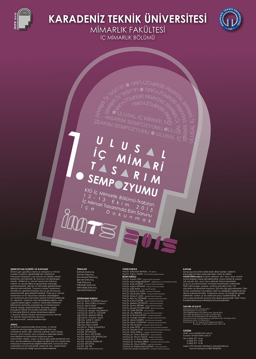 Karadeniz Teknik Üniversitesi Mimarlık Fakültesi İç Mimarlık Bölümü olarak 12-13 Ekim 2015 tarihinde düzenleyeceğimiz I. Ulusal İç Mimari Tasarım Sempozyumunun teması “İç Mimari Tasarımda Esin Sorunu / İçe Dokunmak” olarak belirlenmiştir.