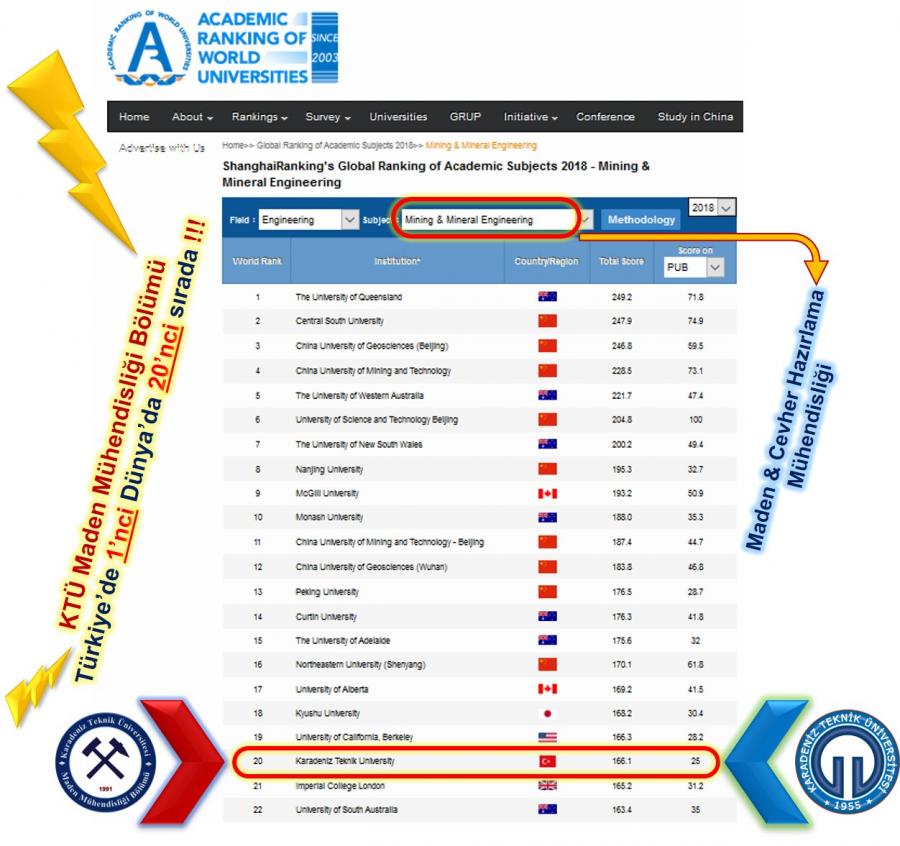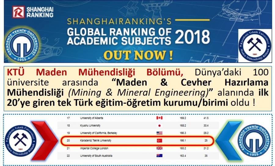 Karadeniz Teknik Üniversitesi (KTÜ) Maden Mühendisliği Bölümü, Dünya’daki üniversitelerin mühendislik bölümlerinin performanslarını (2012-2016) karşılaştıran istatistiklerde “Maden & Cevher Hazırlama Mühendisliği (Mining & Mineral Engineering)” alanında 100 üniversite/bölüm arasında ilk 20’ye giren tek Türk eğitim-öğretim kurumu/birimi oldu.