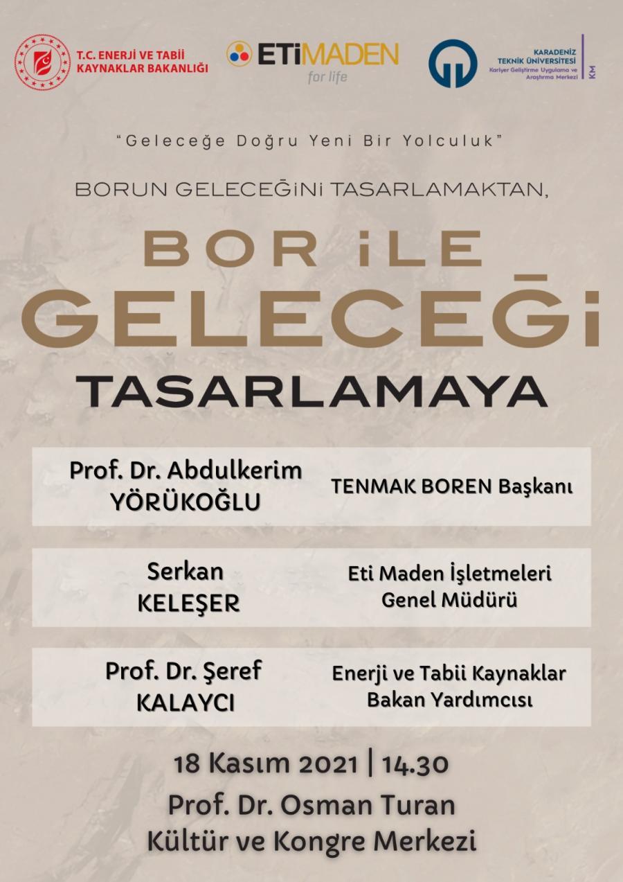 T.C. Enerji ve Tabii Kaynaklar Bakanlığı, Eti Maden İşletmeleri ve KTÜ Kariyer Geliştirme Uygulama ve Araştırma Merkezi işbirliğiyle 18 Kasım 2021 saat 14.30’da Prof. Dr. Osman Turan Kültür ve Kongre Merkezi’nde Enerji ve Tabii Kaynaklar Bakan Yardımcısı Prof. Dr. Şeref KALAYCI, TENMAK BOREN Başkanı Prof. Dr. Abdülkerim YÖRÜKOĞLU ve Eti Maden İşletmeleri Genel Müdürü Serkan KELEŞER’in katılımlarıyla gerçekleştirilecek olan “Borun Geleceğini Tasarlamaktan Bor İle Geleceği Tasarlamaya” isimli etkinliğimize tüm öğrencilerimiz davetlidir.