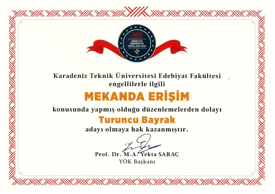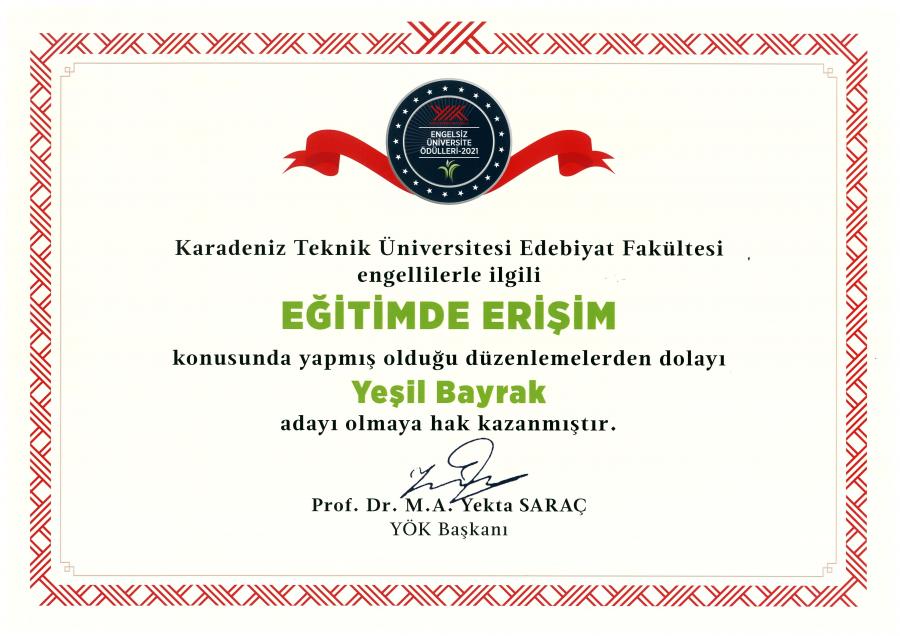Edebiyat Fakültesi – Eğitimde Erişim (Yeşil Bayrak) adayı olmaya hak kazanmıştır.