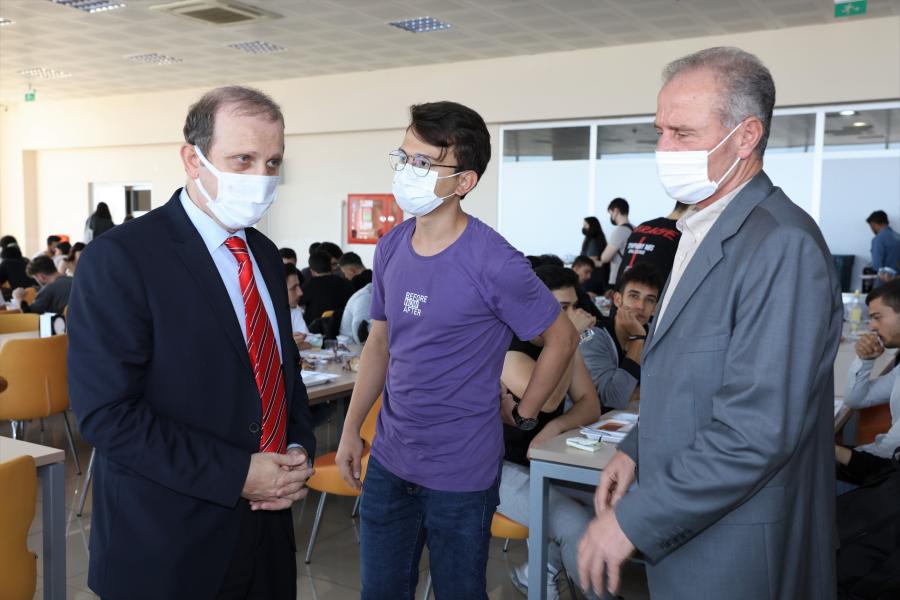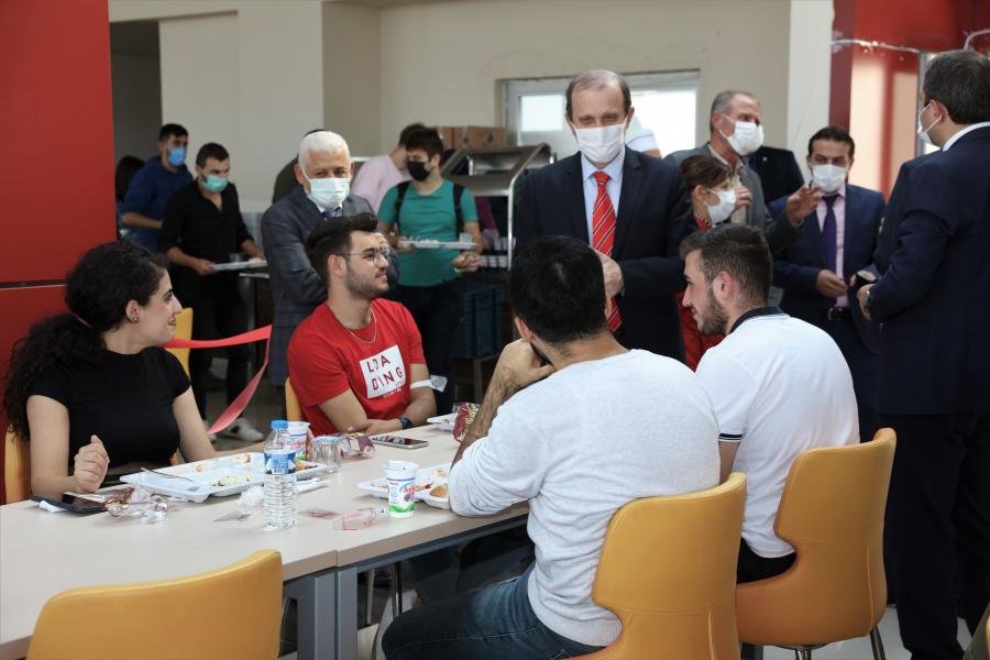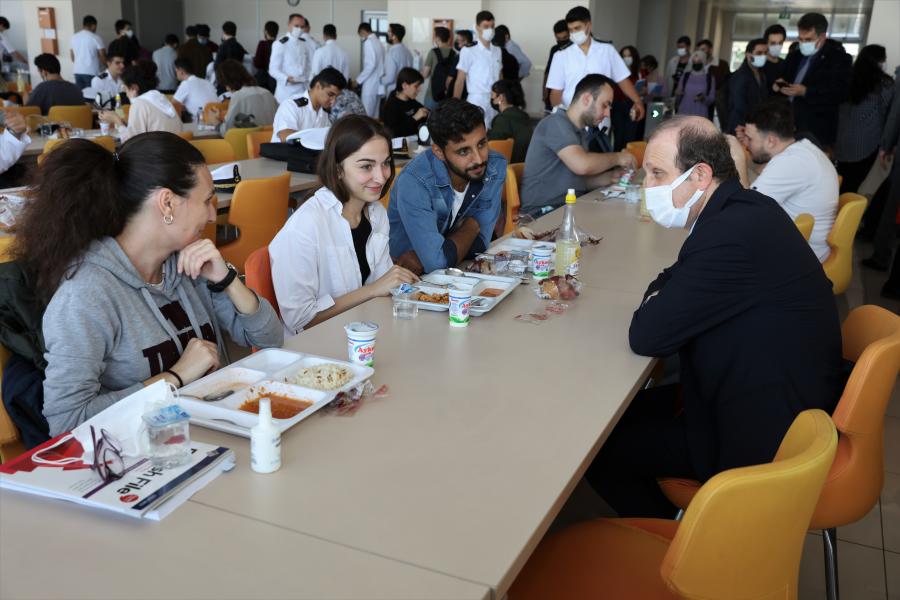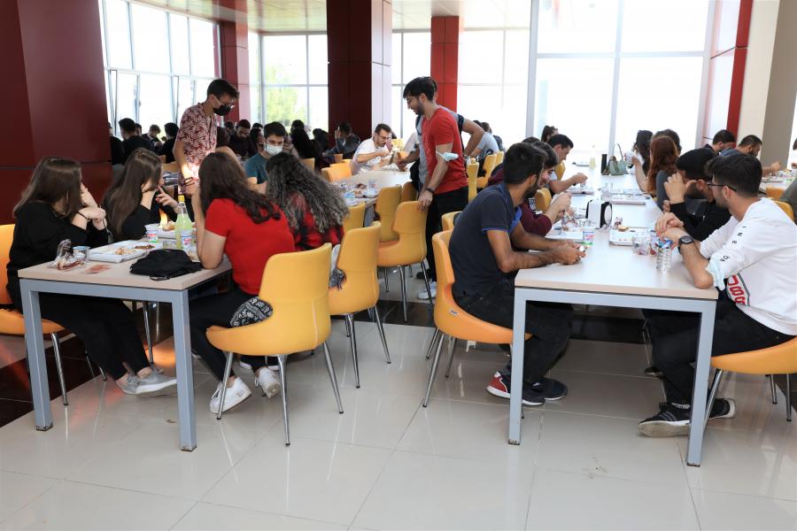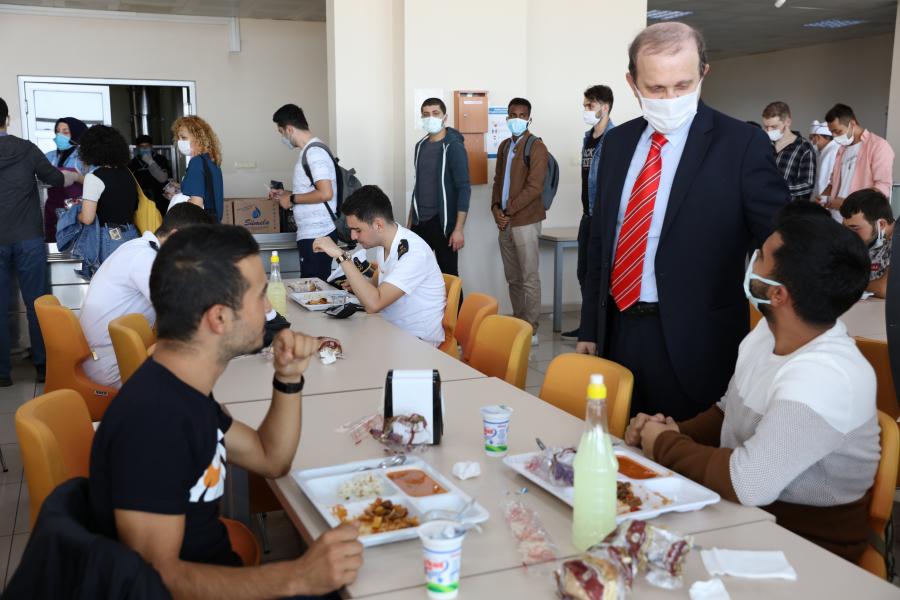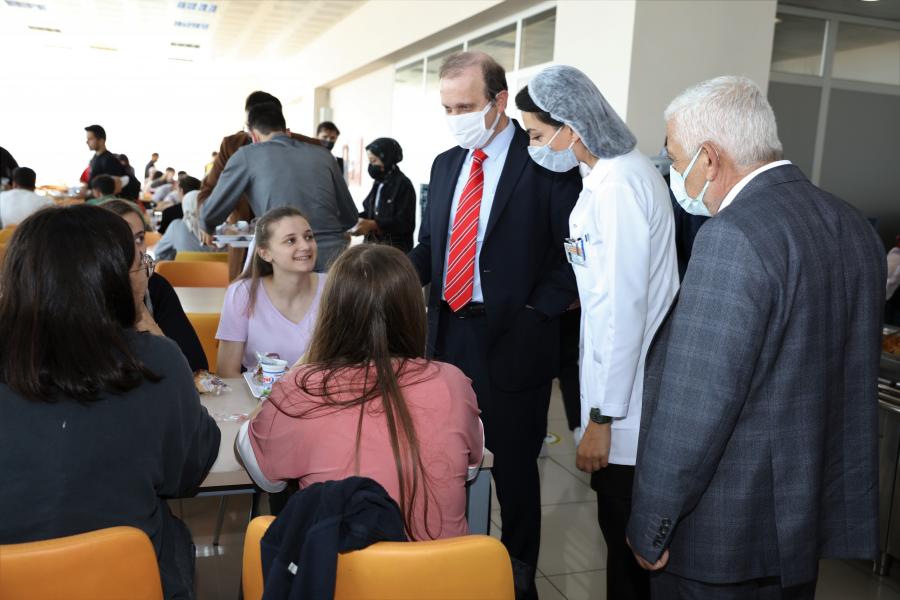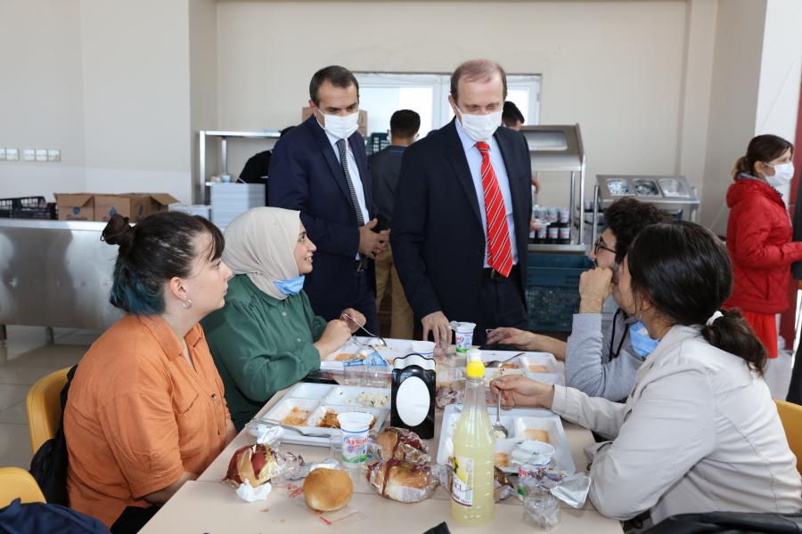 2021-2022 Akademik Yılı ile birlikte yüz yüze eğitimin başlamasının ardından okullarına kavuşan öğrencilerimiz ile sohbet ederek öğle yemeği yedi. Öğrencilerimizin talep ve önerilerini dinledikten sonra incelemelerde bulunan ve başta beslenme, barınma, ulaşım olmak üzere onların tüm sosyal olanaklarının, en yüksek standartlarda sunulması adına çok çaba sarf edildiğini vurgulayan Rektörümüz, yüksek kaliteli yemek hizmetlerinden öğrencilerimizin cüzi bir miktar ödeme yaparak faydalandığını ve bir öğünde öğrencilerimize 4,00 TL karşılığında verilen ve ihale yöntemi ile alınan dört çeşit öğle yemeğinin maliyetinin, 2021 yılı sonuna kadar 19,32 TL olup bu ücretin 15,32 TL’sinin Üniversitemiz tarafından karşılandığını, 4,00 TL’sinin ise öğrencilerimiz tarafından ödendiğini dile getirdi.
