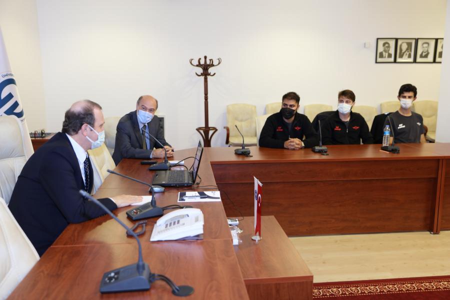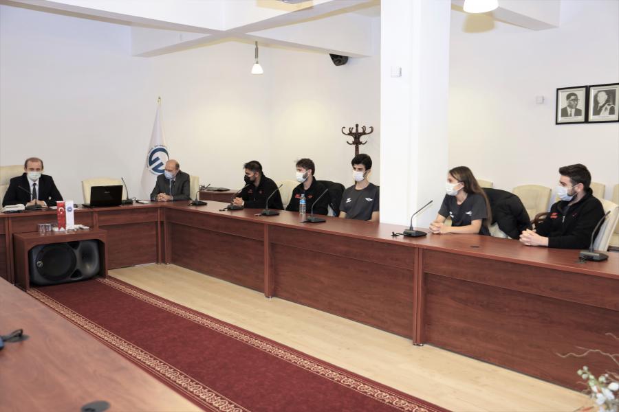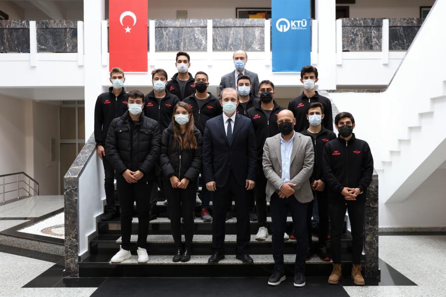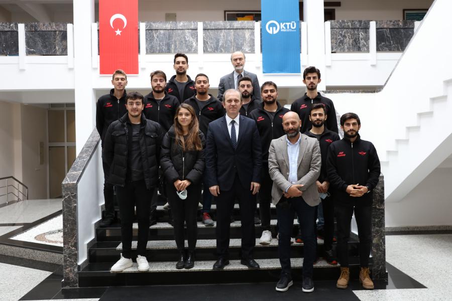 Akademik Danışmanları Prof. Dr. Yasin ALEMDAĞ başkanlığında bir araya gelen KTÜ Enerji Teknolojileri Topluluğu öğrencileri; Takım Kaptanı Oğuzhan ÇAKMAK, Takım Kaptan Yardımcısı Orhun Can UZUN, Mekanik Birimi Sorumlusu Nafız ÖNEL, Tasarım Birimi Sorumlusu Nuri YILDIZ, Malzeme Birimi Sorumlusu Mert ÇETİN, Elektrik Birimi Sorumlusu Beyza Gül ŞİMŞEK, Medya ve Sponsorluk Birimi Sorumlusu Nihat KOCAMAN, Takım Üyesi; Yunus Emre ÜZMEZ, Uğurcan BALAMİR, Sugur Berke MİDİLLİ ve Selçuk Kaan SAVAŞKAN, Rektörümüz Prof. Dr. Hamdullah ÇUVALCI tarafından Rektörlük makamında ağırlandı. Ziyarette, geleceğe yönelik çalışmalar hakkında görüş alışverişinde bulunularak hedefler belirlendi.