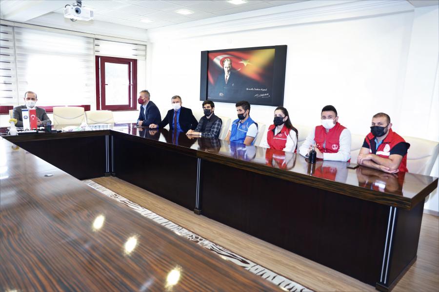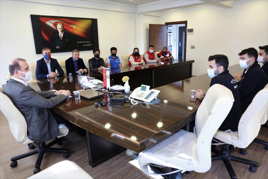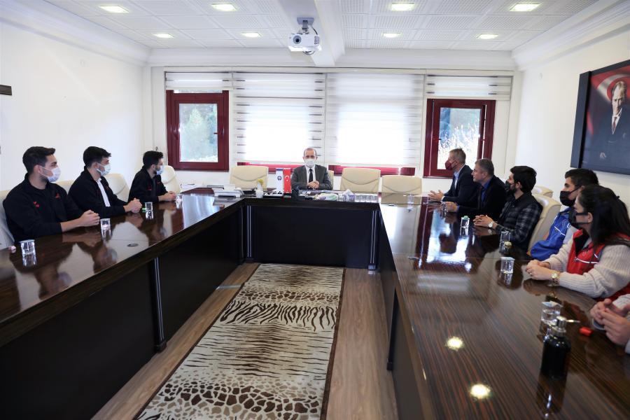 21-26 Eylül tarihleri arasında İstanbul’da düzenlenen TEKNOFEST2021 Yarışması kapsamında Elektrikli Araç Kategorisi’nde Birincilik Ödülü alan Yomra Gençlik Merkezi Üyesi ve Üniversitemiz Mühendislik Fakültesi Makine Mühendisliği ve Elektrik-Elektronik Mühendisliği öğrencilerinden oluşan heyet, Yomra Gençlik ve Spor İlçe Müdürü Cengiz AYDOĞDU ile birlikte Rektörümüz Prof. Dr. Hamdullah ÇUVALCI’ya teşekkür ziyareti gerçekleştirdi. Ziyarette, yeni projelerle ilgili görüş alışverişinde bulunuldu.