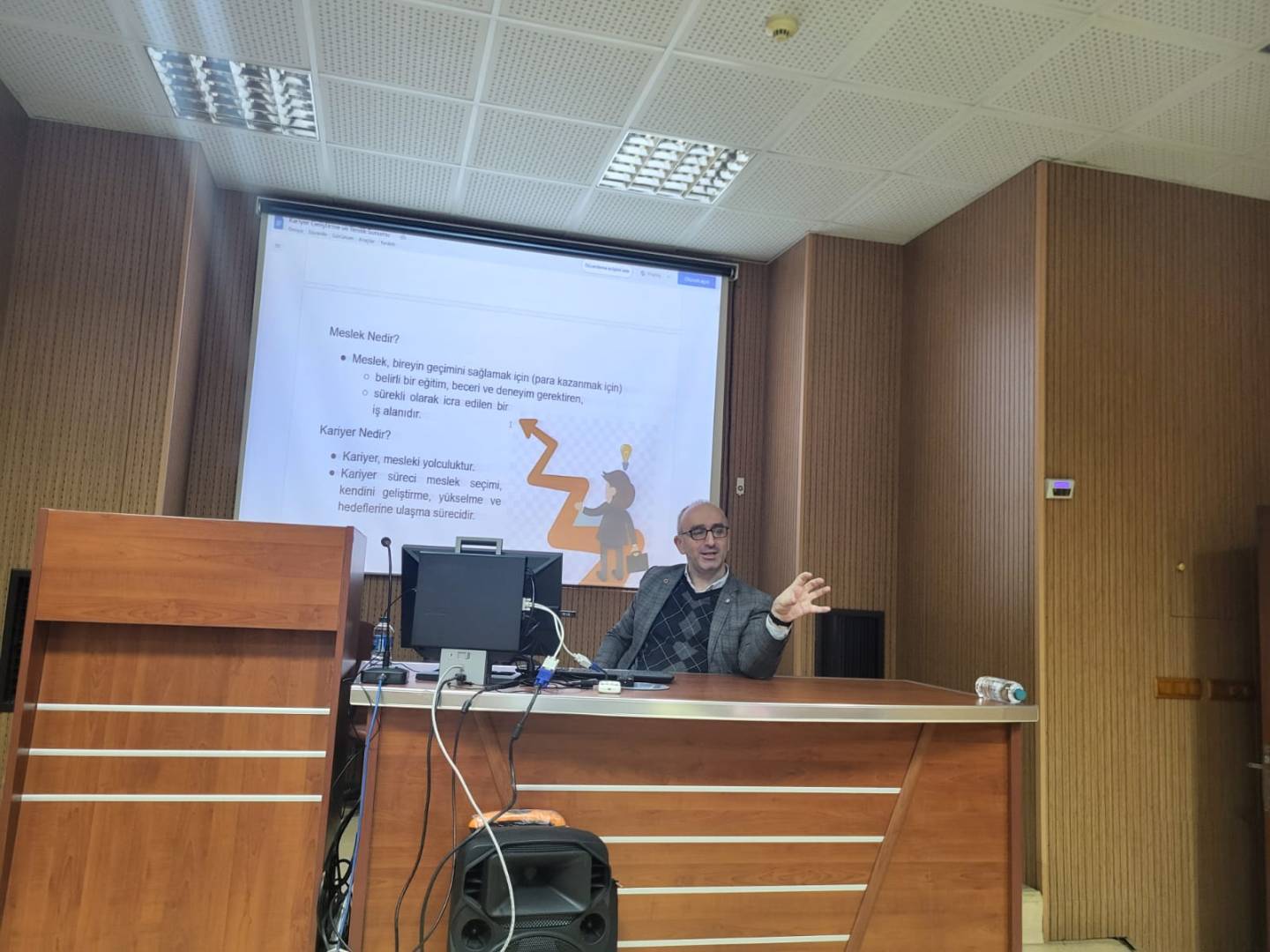 2025-2026 Eğitim Öğretim Yılı Güz Yaryılında Oryantasyon Programı kapsamında Mimarlık ve Şehir Planlama, Makina ve Metal Teknolojileri ve Tasarım Bölümü öğrencilerimize Kariyer Geliştirme Uygulama ve Araştırma Merkezi Müdür Yardımcısı Öğr. Gör. Dr. Zafer YAVUZ tarafından Kariyer Geliştirme ve Özgelecek Hazırlama konulu sunum gerçekleştirildi. İlgili sunumda mezun olacak öğrencilerin çalışma hayatına başlarken karşılaşabilecekleri sorunlar ve çözümleri, etkili iletişim yöntemlerinin iş başvurusunda ve diğer süreçlerdeki önemi başarılı bir kariyer için yapılması gerekenler konusunda ilgili bölümlerin 1. sınıf öğrencilerine bilgi ve tecrübeler aktarılmıştır. Programa Müdür Yardımcımız Dr. Öğretim Üyesi Hamdi ÖZTÜRK katılım sağlamıştır.