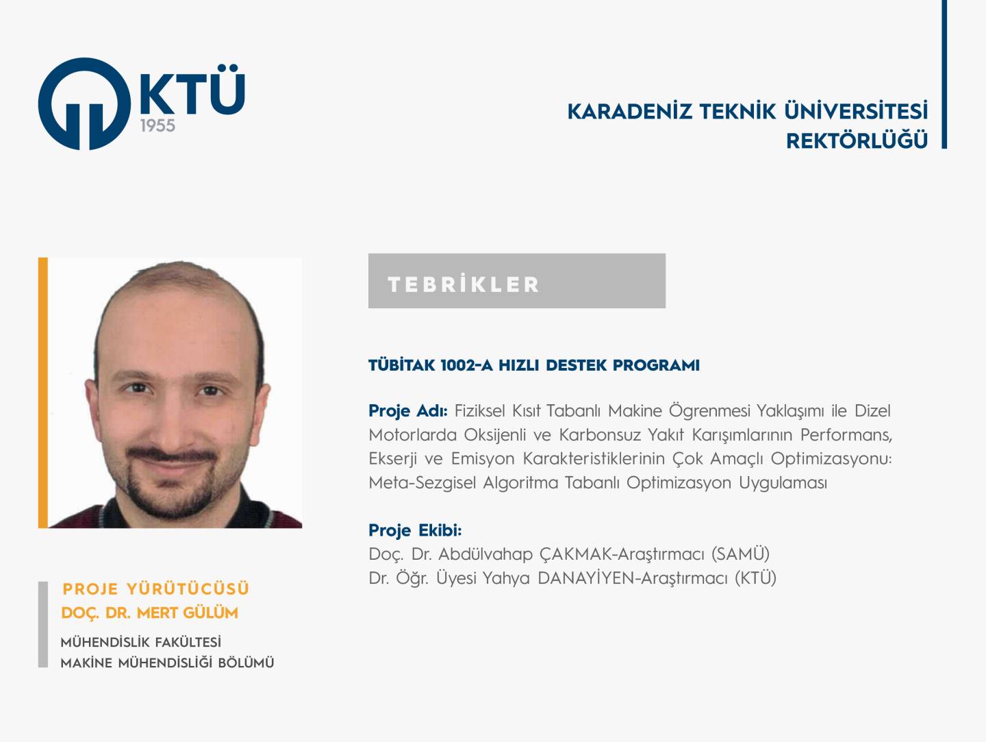 Doç. Dr. Mert GÜLÜM'e TÜBİTAK 1002-A Hızlı Destek Programı Proje Desteği