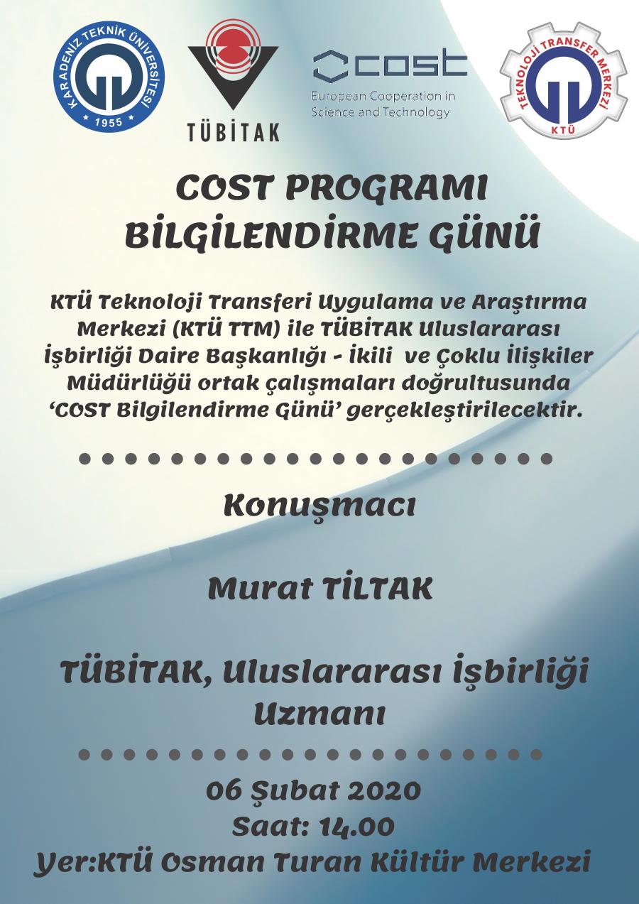 KTÜ TTM ve TÜBİTAK Avrupa Birliği Koordinasyon Ofisi işbirliği ile KTÜ' de düzenlenecek olan Bilim ve Teknolojide Avrupa İşbirliği Kuruluşu (COST) bilgilendirme gününün detayları aşağıdaki gibidir;