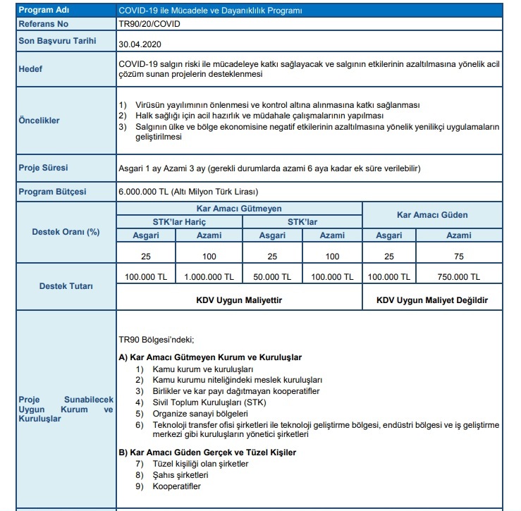 Doğu Karadeniz Kalkınma Ajansı, Bölgemizin ve ülkemizin COVID-19 salgını ile mücadelesine katkı sağlamak; salgının yayılımının en aza indirilmesi ve kontrol altına alınmasını, başta risk altındaki gruplar olmak üzere toplum sağlığının korunması ve salgının olumsuz sosyo-ekonomik etkilerinin hafifletilmesi amacıyla toplam bütçesi 6.000.000 TL olan “COVID-19 İle Mücadele ve Dayanıklılık Programı”nı başlatmış bulunmaktadır.