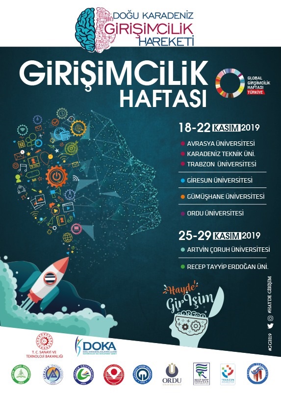Tüm dünyada her yıl kasım ayında eş zamanlı olarak kutlanan Global Girişimcilik Haftası bu yıl ilk defa bölge üniversitelerinin de katılımıyla bölgesel çapta kutlanacak. Doğu Karadeniz Kalkınma Ajansı işbirliğiyle, Trabzon Teknokent ve GİPAK desteği ile KTÜ TTM tarafından organize edilen etkinlik 18-22 Kasım tarihlerinde konferans, yarışma, workshop ve paneller ile Karadeniz Teknik Üniversitesi Osman Turan Kültür ve Kongre Merkezi'nde gerçekleştirilecektir. Program akışı için takipte kalın. #GGH19 , @HAYDEGİRİSİM