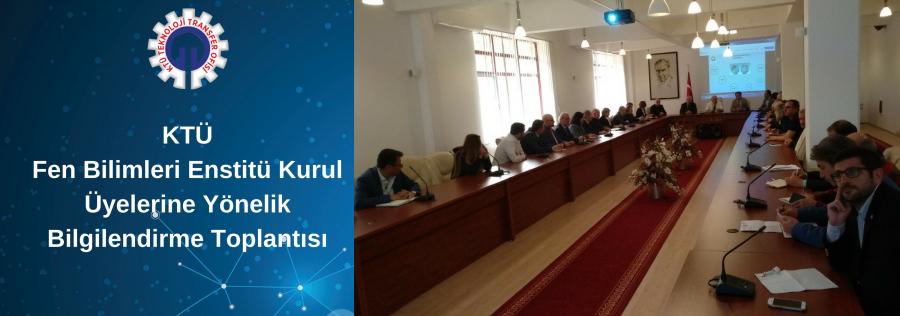 Fen Bilimleri Enstitü Kurulu Üyelerine Rektörlük Senato Salonunda KTÜ Rektörü Prof. Dr. Süleyman BAYKAL, Rektör Yardımcısı Prof. Dr. Asım ÖREM, KTÜ TTO Müdürü, KTÜ TTO Yönetim kurulu üyeleri, Fen Bilimleri Enstitü müdürü ve Fen Bilimleri Enstitü Kurul üyelerinin katılımıyla bir toplantı gerçekleştirildi. Toplantıda KTÜ Teknoloji Transfer Ofisi (KTÜ TTO) faaliyetlerinin tanıtımı, 2018 yılı çağrısı açılan TÜBİTAK 1003 Öncelikli AlanlarlarArge projeleri destekleme programı çağrıları ile üniversitemizde yapılan tezler için üniversite-sanayi işbirliğinin arttırılmasına yönelik yapılabilecek çalışmalar görüşüldü.