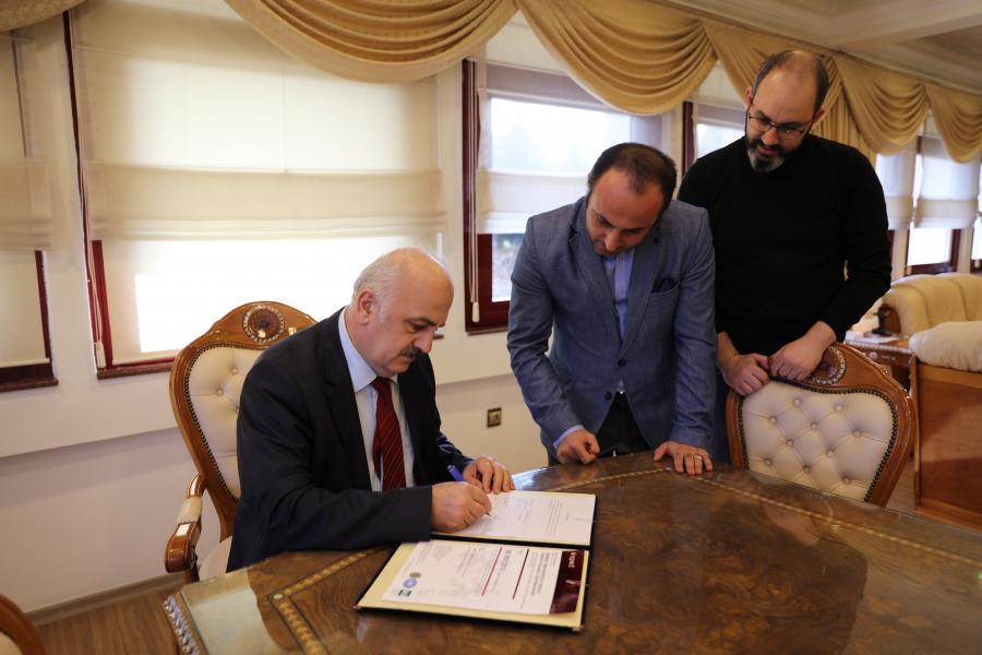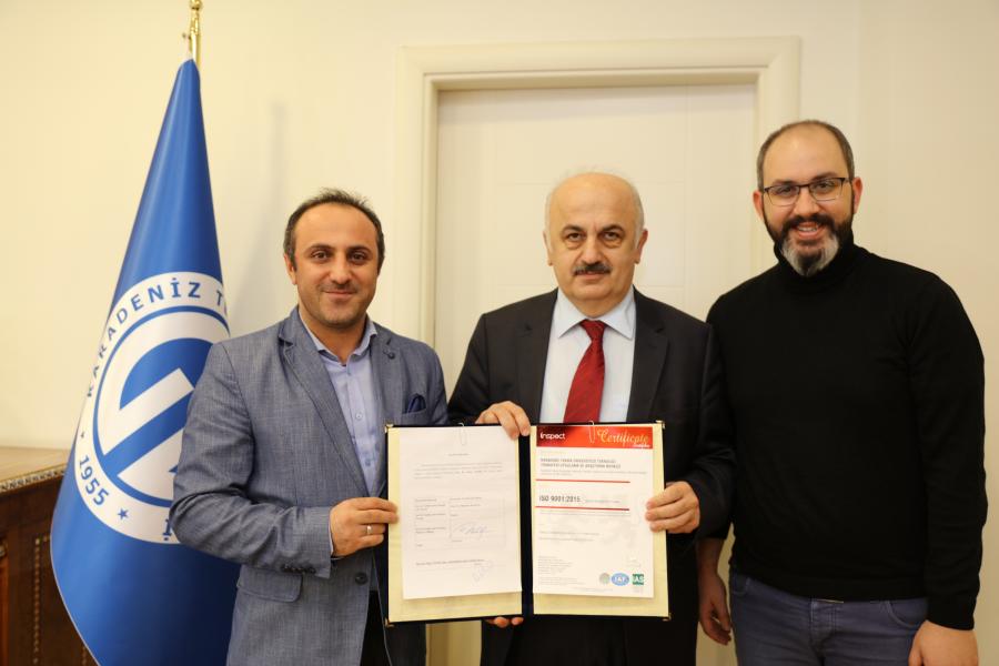 ISO 9001:2015 Kalite Yönetim Sistemi Sertifikası KTÜ TTM Müdürü Doç. Dr. Oktay YILDIZ ve Müdür Yardımcısı Öğr. Gör. Dr. Onur Tolga OKAN tarafından KTÜ Rektörü Prof. Dr. Süleyman BAYKAL'a sunulmuştur.