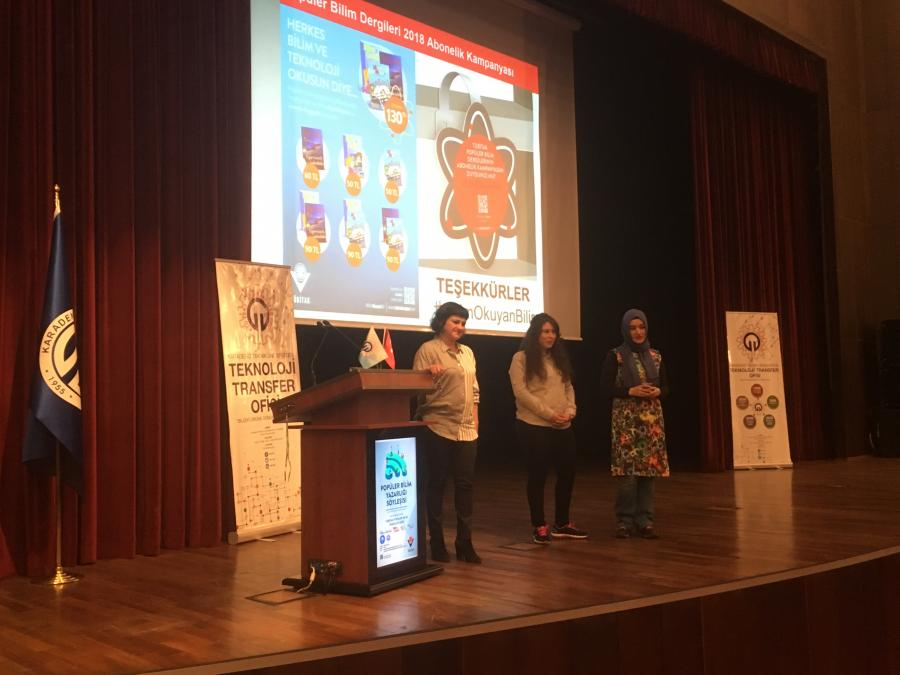 TÜBİTAK Popüler Bilim Dergileri Müdürlüğü tarafından, Karadeniz Teknik Üniversitesi (KTÜ) ve Karadeniz Teknik Üniversitesi Teknoloji Transfer Ofisi (KTÜ TTO) işbirliğinde 6 Nisan Cuma günü saat 11.00’de KTÜ Osman Turan Kongre ve Kültür Merkezi’ nde KTÜ akademisyenleri, lisans, yüksek lisans ve doktora öğrencileri için "Popüler Bilim Yazarlığı Söyleşisi" düzenlendi.