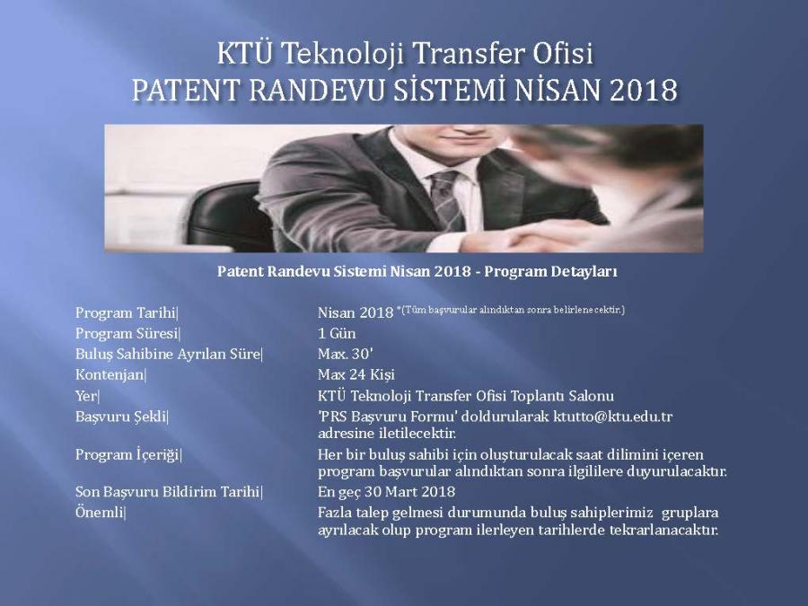 Patent Randevu Sistemi Nisan 2018 programına ait detaylar ekte yer almaktadır.