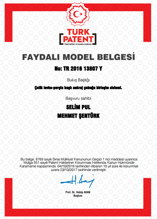 Üniversitemiz akademisyenlerinden Prof. Dr. Selim PUL ve Arş. Gör. Mehmet ŞENTÜRK'ün buluş sahibi olarak yer aldığı faydalı model başvurusu TÜRK PATENT VE MARKA KURUMU tarafından incelenmiş ve ulusal alanda tescil almıştır. 2016/13807 numaralı "ÇELİK LEVHA-PERÇİN BAŞLI ANKRAJ ÇUBUĞU BİRLEŞİM SİSTEMİ" başlıklı buluşa ait faydalı model tescil belgesi almaya hak kazanan değerli akademisyenlerimizi KTÜ-TTO olarak tebrik eder, başarılarının devamını dileriz.