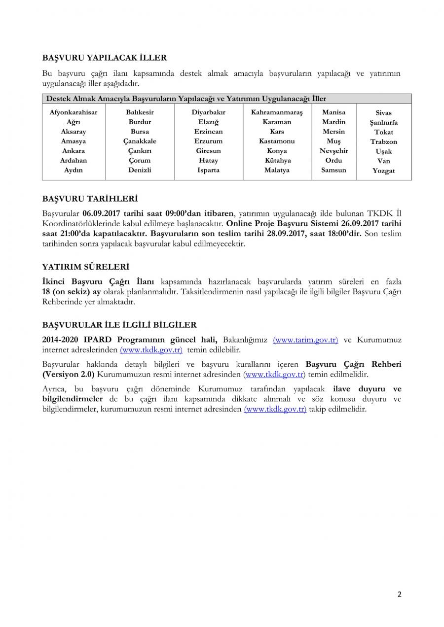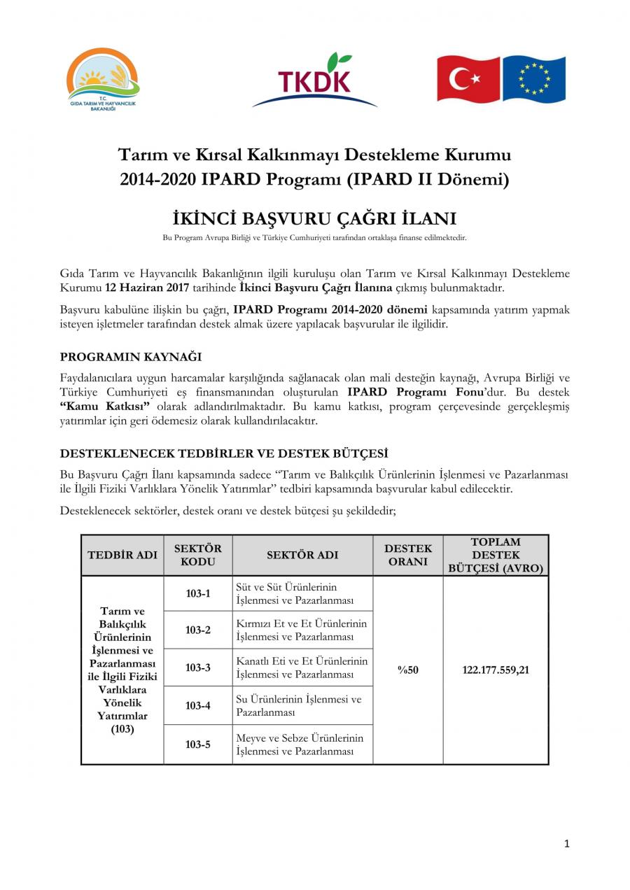 Tarım ve Kırsal Kalkınmayı Destekleme Kurumu 2014-2020 IPARD Programı (IPARD II Dönemi) İKİNCİ BAŞVURU ÇAĞRI İLANI