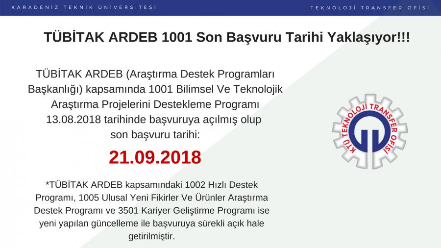 TÜBİTAK ARDEB (Araştırma Destek Programları Başkanlığı) kapsamında 1001 Bilimsel Ve Teknolojik Araştırma Projelerini Destekleme Programı 13.08.2018 tarihinde başvuruya açılmış olup son başvuru tarihi 21.09.2018’ dir.