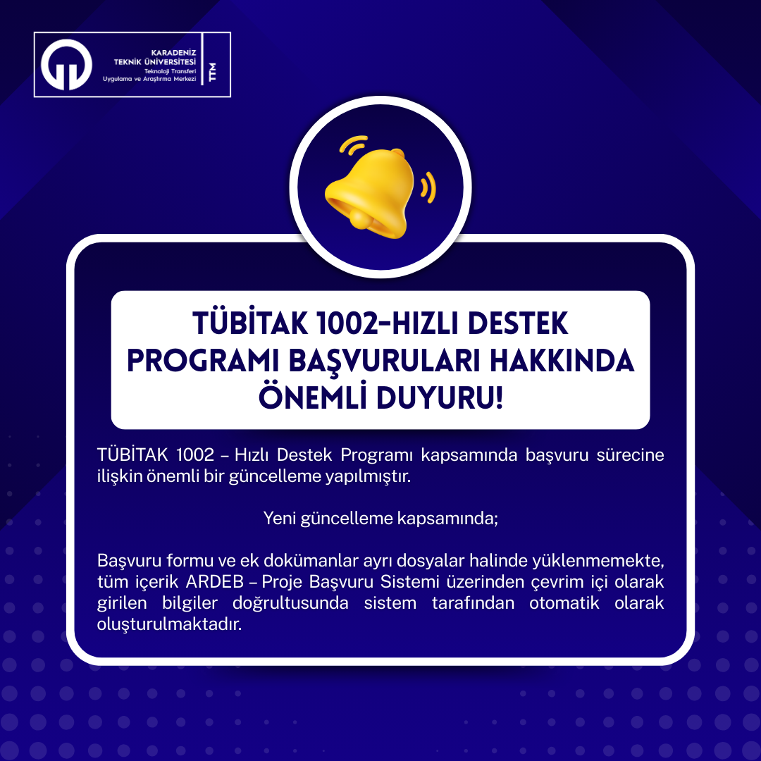 TÜBİTAK 1002-Hızlı Destek Programı kapsamında başvuru sürecine ilişkin önemli bir güncelleme yapılmıştır.