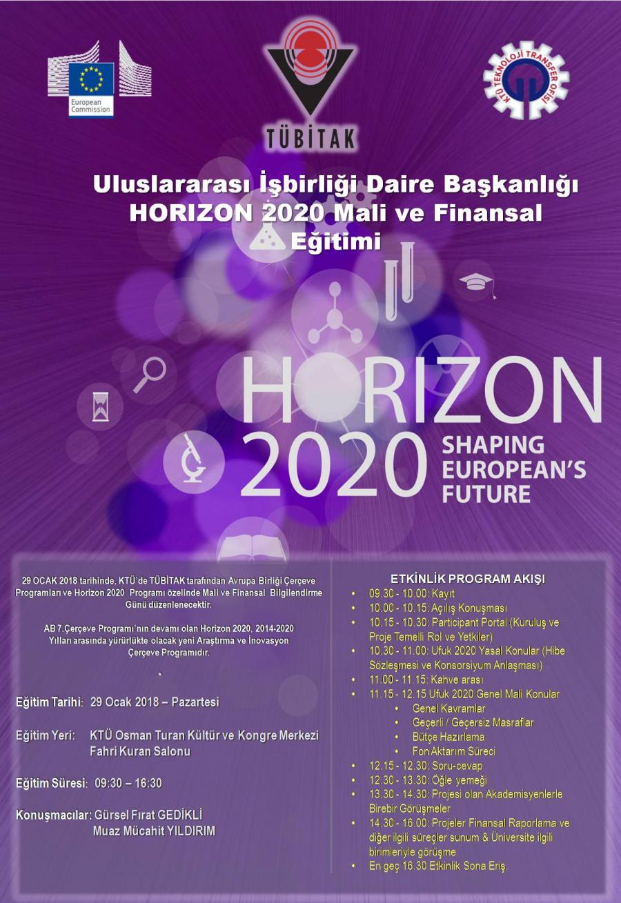 AB 7. Çerçeve Programının devamı niteliğinde yayınlanan HORİZON 2020 araştırma programıyla ilgili "AB Çerçeve Programları Ulusal Koordinasyon Ofisi" tarafından üniversitemizde farkındalık yaratmak adına "Yasal ve Finansal Konular" alanında29 OCAK 2018 tarihinde, KTÜ’de TÜBİTAK tarafından Avrupa Birliği Çerçeve Programları ve Horizon2020  Programı özelinde Mali ve Finansal  Bilgilendirme Günü düzenlenecektir.