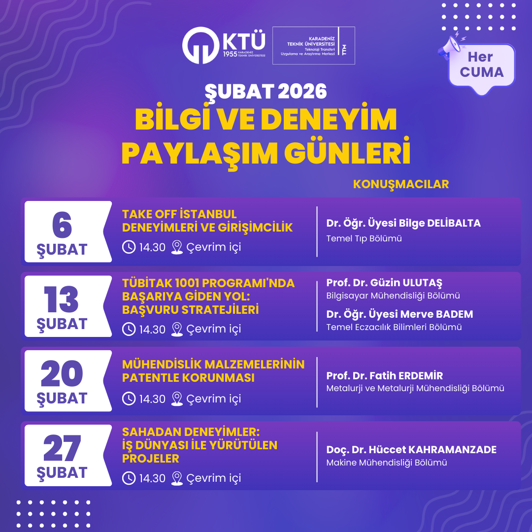 Merkezimizin düzenlediği "Bilgi ve Deneyim Paylaşım Günleri", bilgi ve deneyim paylaşımını artırarak akademi, sanayi ve girişimcilik ekosistemleri arasında güçlü bir iletişim ağı oluşturmayı hedeflemektedir. Bu kapsamda düzenlenecek etkinlikler, her hafta Cuma günü farklı konu ve alanlarda çevrim içi olarak gerçekleştirilecektir.