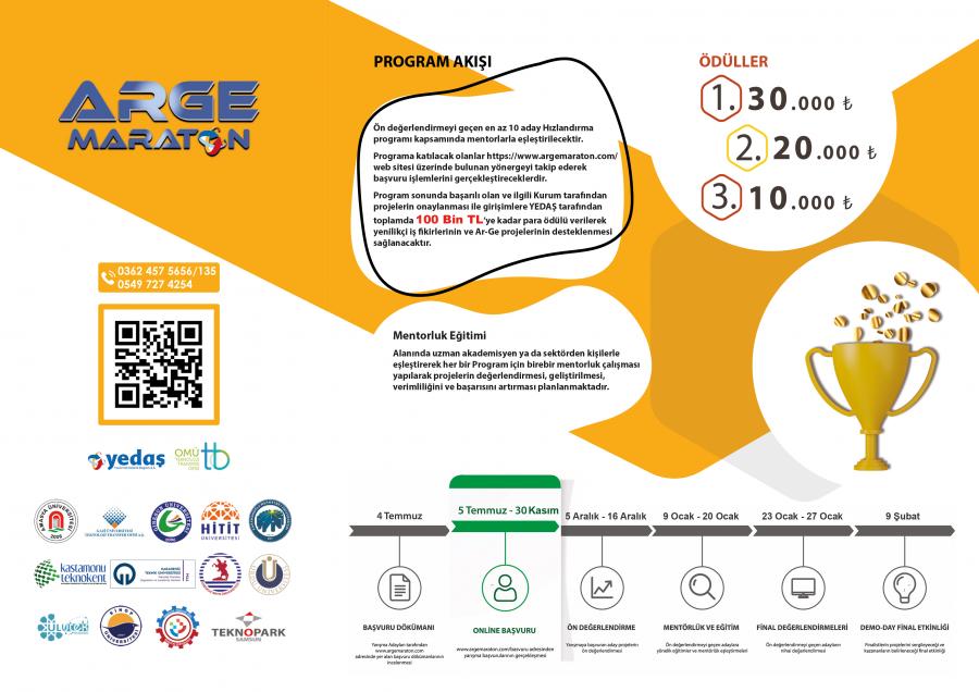 7 Kategoriden oluşan Ar-Ge Maraton Projesinde; 1.'ye 30.000 TL, 2.'ye 20.000 TL, 3.'ye 10.000 TL ödüller verilecek olup son başvuru tarihi 30.11.2022’dir.