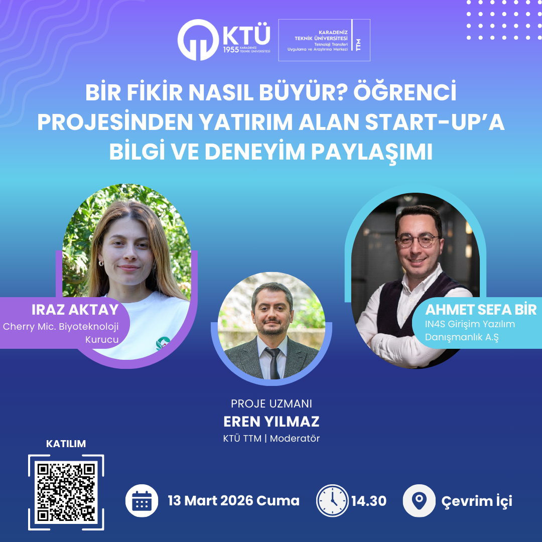 Bir iş fikrinin öğrencilik döneminden başlayarak yatırım alan bir girişime dönüşme sürecini, girişimcilik yolculuğunda karşılaşılan deneyimleri ve bu süreçte edinilen kazanımları Cherry Mic. Biyoteknoloji Kurucusu Iraz AKTAY'ın tecrübelerinden dinleme fırsatı bulacaktır. Iraz AKTAY, kendi girişim hikâyesi üzerinden fikir geliştirme, zorluklarla baş etme, çözüm üretme ve girişimi büyütme süreçlerine ilişkin bilgi ve deneyimlerini paylaşacaktır.