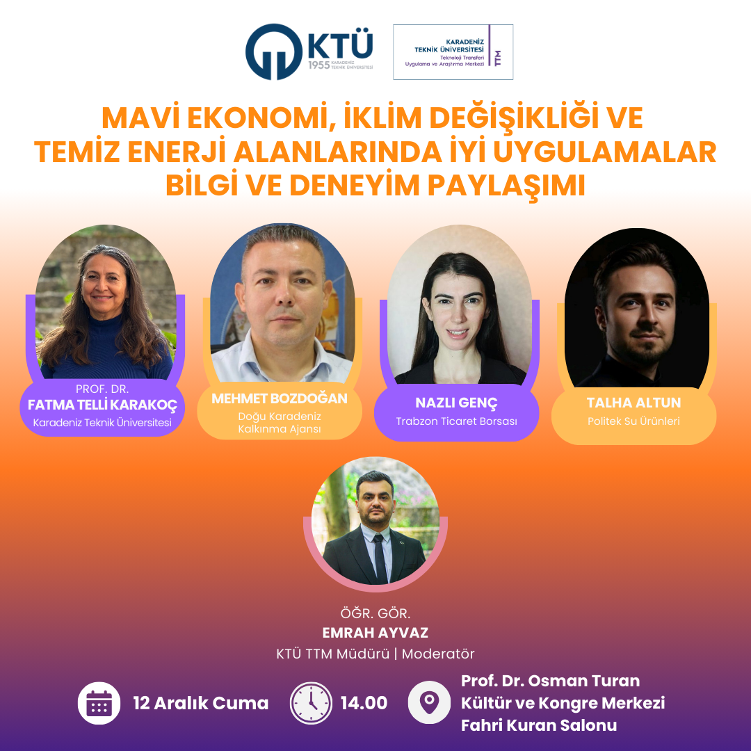 KTÜ TTM tarafından düzenlenen Bilgi ve Deneyim Paylaşım Günleri, Mavi Ekonomi, İklim Değişikliği ve Temiz Enerji Alanlarında İyi Uygulamalar Bilgi ve Deneyim Paylaşım Etkinliği ile devam ediyor.
