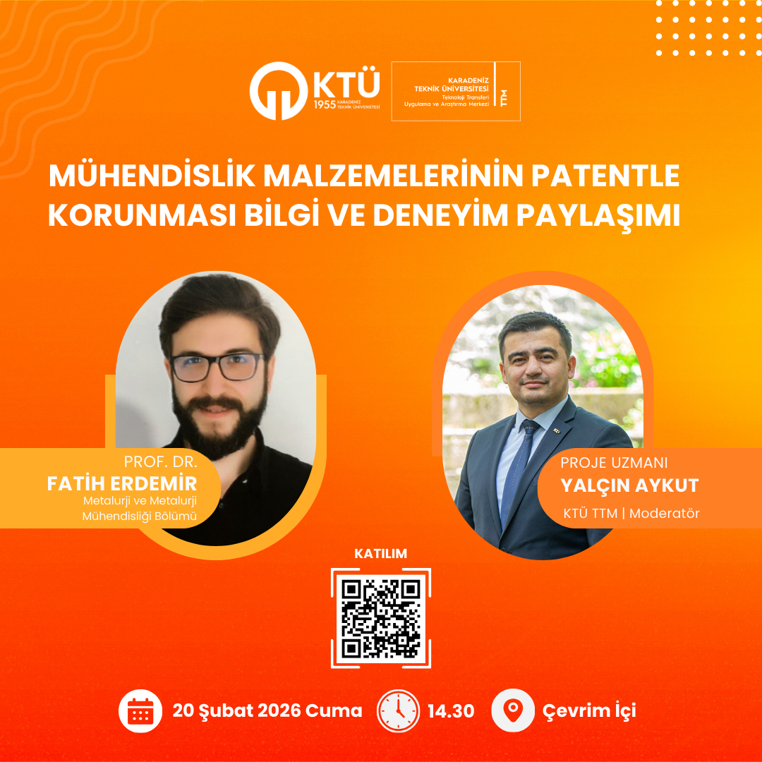 Mühendislik ve malzeme alanında patentleme kriterleri, akademik araştırmaların fikri mülkiyet değerine dönüştürülme süreçleri, başvuru aşamalarında karşılaşılan zorluklar ve ticarileşme boyutu ele alınarak katılımcılar söz konusu konular hakkında Prof. Dr. Fatih ERDEMİR’in tecrübelerini dinleme fırsatı bulacaktır.