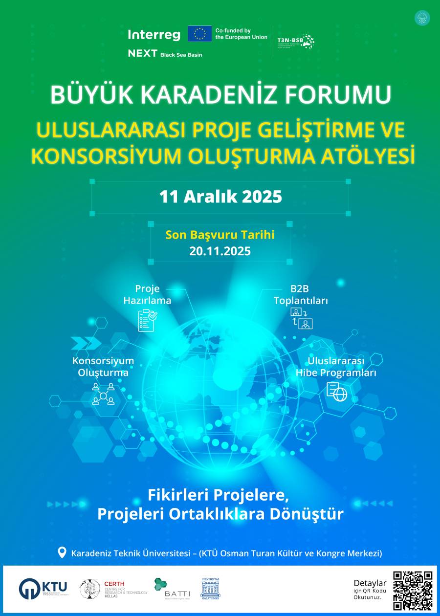 10-12 Aralık 2025 tarihlerinde Trabzon’da gerçekleştirilecek ve Karadeniz Teknik Üniversitesi tarafından ev sahipliği yapılacak Büyük Karadeniz Forumu (Grand Black Sea Forum / T3N-BSB Project) kapsamında, katılımcılar bölgedeki önemli sorunlara yönelik iş birliğine dayalı projelerin geliştirilmesini amaçlayan atölye çalışmasına davet edilmektedir.