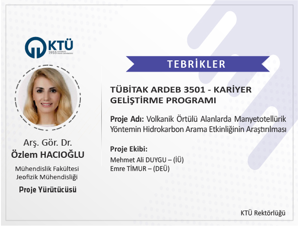Üniversitemiz Mühendislik Fakültesi Jeofizik Mühendisliği Bölümü Öğretim Üyesi Arş. Gör. Dr. Özlem HACIOĞLU’nun "Volkanik Örtülü Alanlarda Manyetotellürik Yöntemin Hidrokarbon Arama Etkinliğinin Araştırılması" başlıklı projesi TÜBİTAK 3501 – “Kariyer Geliştirme Programı” kapsamında desteklenmiştir.