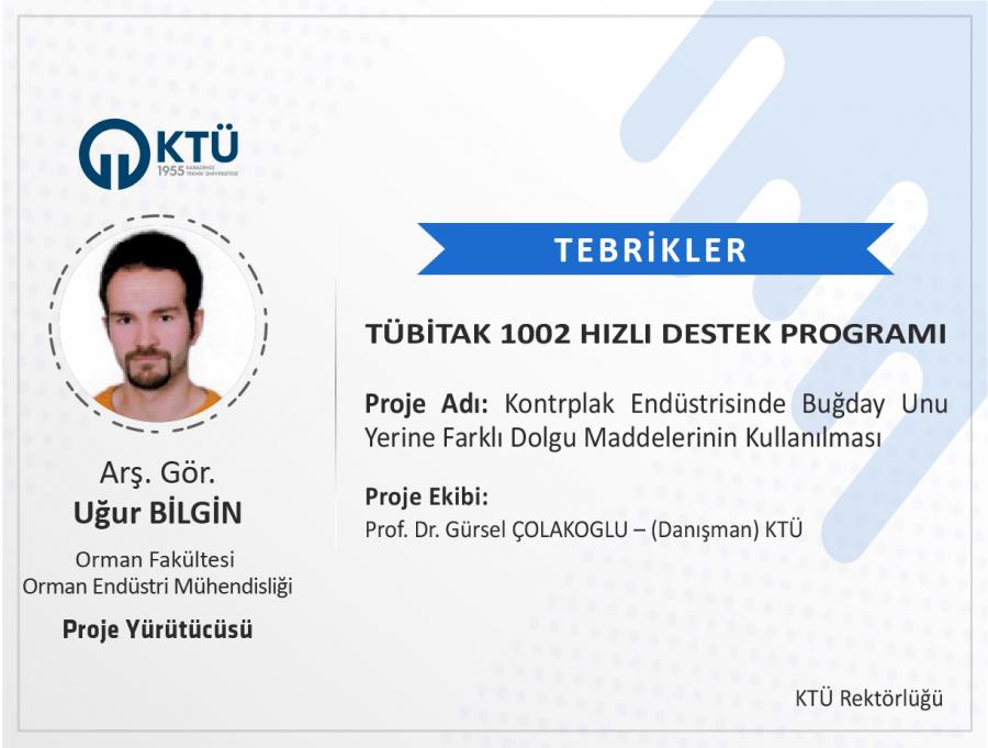 Üniversitemiz Orman Fakültesi Orman Endüstri Mühendisliği Bölümü öğretim üyesi Arş. Gör. Uğur BİLGİN’in "Kontrplak Endüstrisinde Buğday Unu Yerine Farklı Dolgu Maddelerinin Kullanılması" başlıklı projesi “TÜBİTAK 1002 – Hızlı Destek Programı” kapsamında desteklenmiştir.
