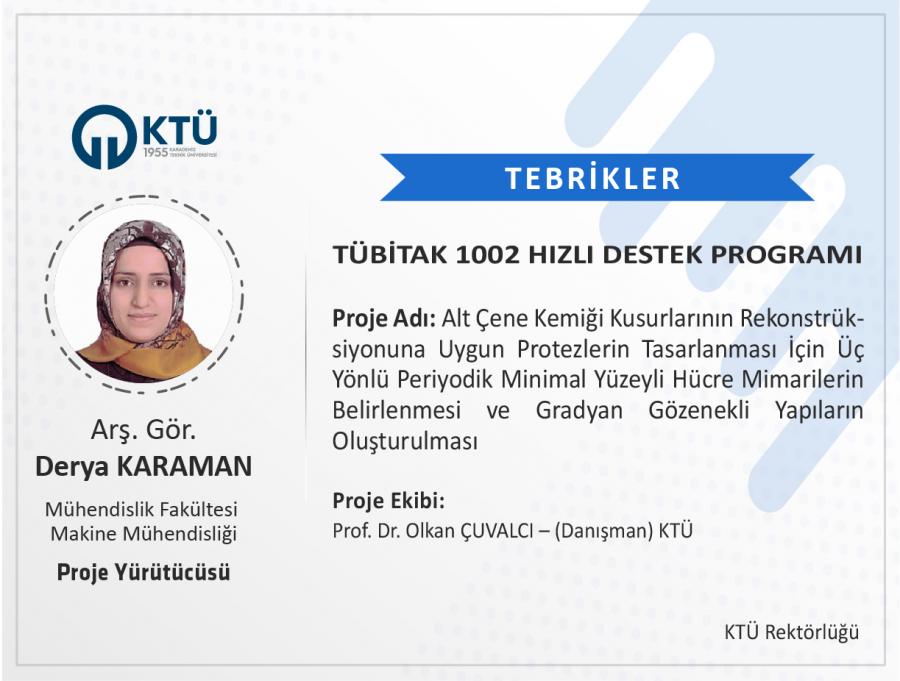 Üniversitemiz Mühendislik Fakültesi Makine Mühendisliği Bölümü öğretim üyesi Arş. Gör. Derya KARAMAN’ın "Alt Çene Kemiği Kusurlarının Rekonstrüksiyonuna Uygun Protezlerin Tasarlanması İçin Üç Yönlü Periyodik Minimal Yüzeyli Hücre Mimarilerin Belirlenmesi ve Gradyan Gözenekli Yapıların Oluşturulması" başlıklı projesi “TÜBİTAK 1002 Hızlı Destek Programı” kapsamında desteklenmiştir.