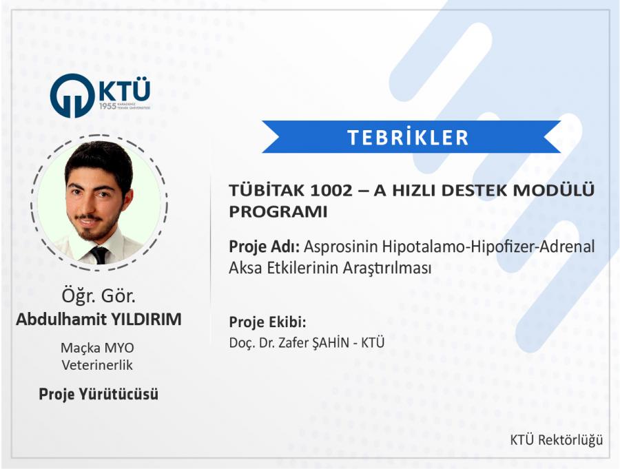Üniversitemiz Maçka Meslek Yüksekokulu Veterinerlik Bölümü öğretim üyesi Öğr. Gör. Abdulhamit YILDIRIM’ın "Asprosinin Hipotalamo-Hipofizer-Adrenal Aksa Etkilerinin Araştırılması" başlıklı projesi TÜBİTAK 1002-A “Hızlı Destek Modülü Programı” kapsamında desteklenmiştir.