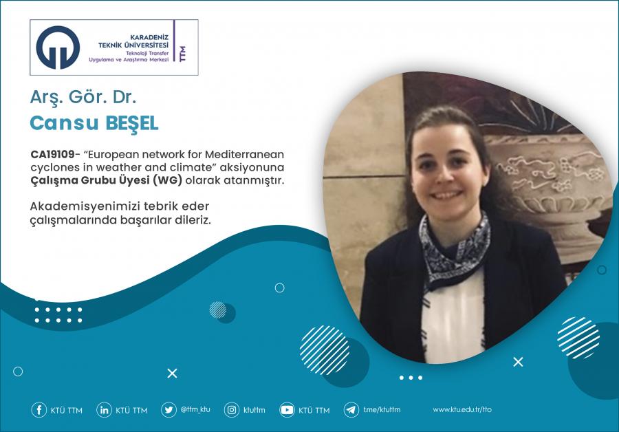 Üniversitemiz Fen Bilimleri Enstitüsü - öğretim elemanı Arş. Gör. Cansu BEŞEL, COST Programı’nın “CA19109 - European network for Mediterranean cyclones in weather and climate” aksiyonuna Çalışma Grubu Üyesi (WG) olarak atanmıştır.