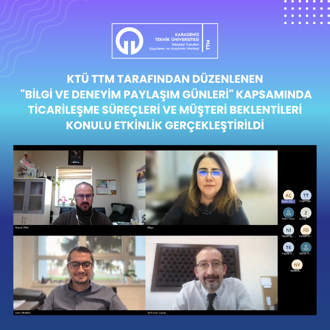 KTÜ Teknoloji Transferi Uygulama ve Araştırma Merkezi tarafından düzenlenen Bilgi ve Deneyim Paylaşım Günleri etkinlik serisi kapsamında, 19 Aralık 2025 Cuma günü saat 14.30’da çevrim içi olarak “Ticarileşme Süreçleri ve Müşteri Beklentileri” başlıklı deneyim paylaşımı gerçekleştirildi.