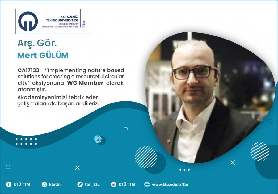 Üniversitemiz Mühendislik Fakültesi Makina Mühendisliği Bölümü öğretim elemanı Arş. Gör. Mert GÜLÜM , COST Programı’nın "CA17133 - Implementing nature based solutions for creating a resourceful circular city" isimli aksiyona WG Member olarak atanmıştır.