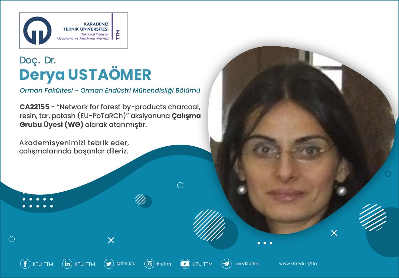 Üniversitemiz Orman Fakültesi Orman Endüstri Mühendisliği Bölümü öğretim üyesi Doç. Dr. Derya USTAÖMER, COST Programı’nın “CA22155 - Network for forest by-products charcoal, resin, tar, potash (EU-PoTaRCh)” aksiyonuna Çalışma Grubu Üyesi (WG) olarak atanmıştır.