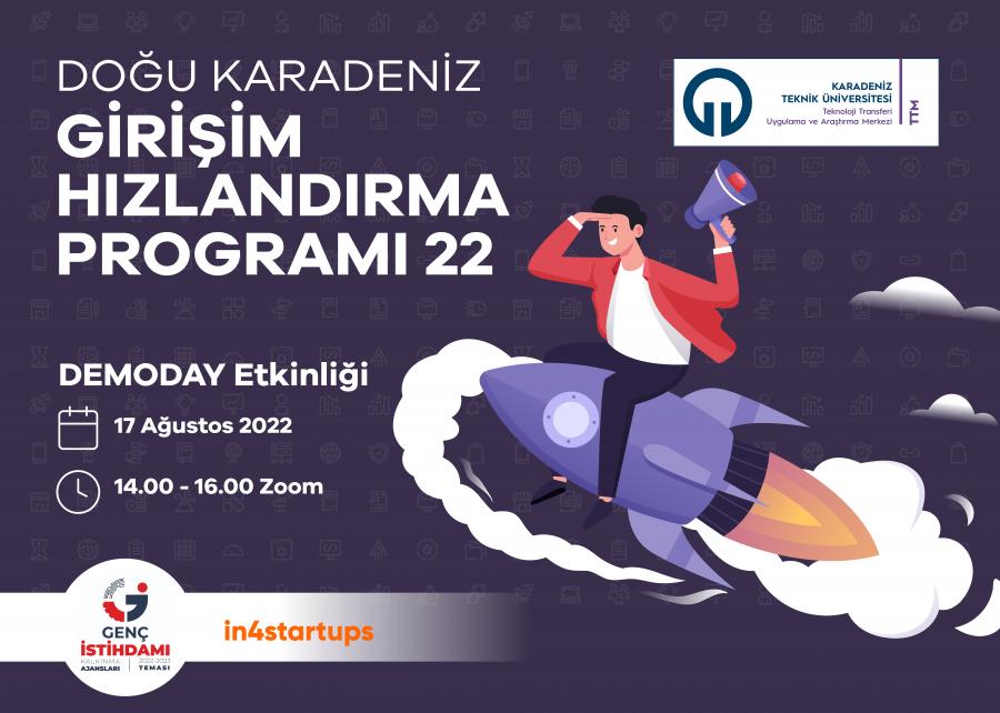 KTÜ TTM tarafından yürütülen Doğu Karadeniz Girişim Hızlandırma Programı 22'nin sunum günü etkinliği 17 Ağustos'ta saat 14:00'te gerçekleştirilecektir.
